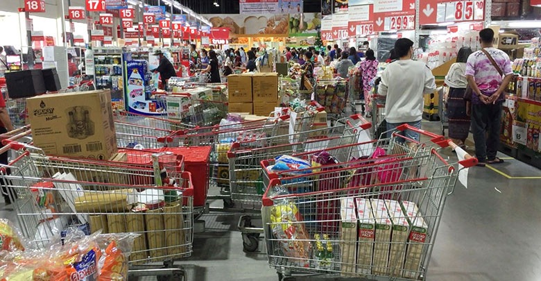 บรรยากาศประชาชนได้ทยอยเดินทางไปซื้อสินค้าทั้งของใช้จำเป็น โดยทางห้างมีมาตรการคัดกรองเข้มมีการลงทะเบียนแอปพลิเคชันไทยชนะ และตรวจวัดอุณภูมิร่างกายก่อนเข้าห้าง ประชาชนที่เดินทางมาซื้อสินค้า ทุกคนสวมใส่หน้ากากอนามัย ส่วนสินค้าที่ประชาชนซื้อเป็นของสดและของแห้ง เพื่อกักตุนไว้ในกรณีที่สถานการณ์แพร่ระบาดไวรัสโควิด-19 รุนแรงมากขึ้น สินค้าส่วนใหญ่ที่ประชาชนซื้อ คือ น้ำดื่ม ปลากระป๋อง ข้าวสาร รวมถึงบะหมี่กึ่งสำเร็จรูป พนักงานห้างต้องประจำอยู่แต่ละจุด และเติมสินค้าต่อเนื่องให้เพียงพอกับความต้องการของประชาชน
