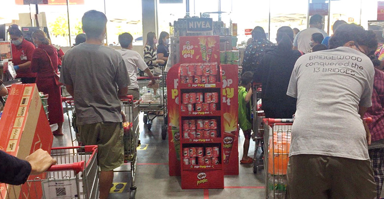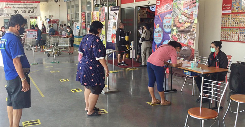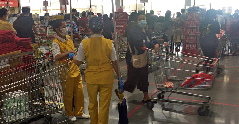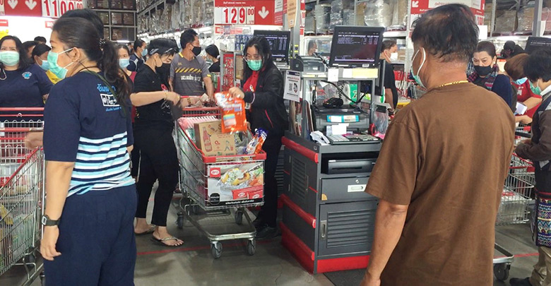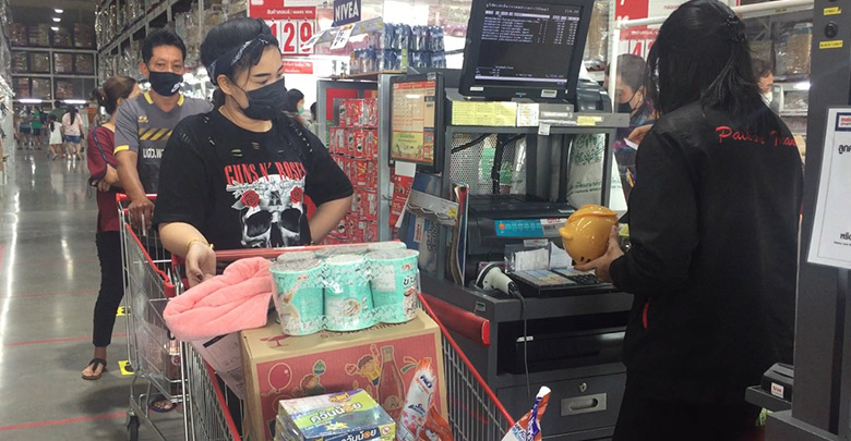 บรรยากาศประชาชนได้ทยอยเดินทางไปซื้อสินค้าทั้งของใช้จำเป็น โดยทางห้างมีมาตรการคัดกรองเข้มมีการลงทะเบียนแอปพลิเคชันไทยชนะ และตรวจวัดอุณภูมิร่างกายก่อนเข้าห้าง ประชาชนที่เดินทางมาซื้อสินค้า ทุกคนสวมใส่หน้ากากอนามัย ส่วนสินค้าที่ประชาชนซื้อเป็นของสดและของแห้ง เพื่อกักตุนไว้ในกรณีที่สถานการณ์แพร่ระบาดไวรัสโควิด-19 รุนแรงมากขึ้น สินค้าส่วนใหญ่ที่ประชาชนซื้อ คือ น้ำดื่ม ปลากระป๋อง ข้าวสาร รวมถึงบะหมี่กึ่งสำเร็จรูป พนักงานห้างต้องประจำอยู่แต่ละจุด และเติมสินค้าต่อเนื่องให้เพียงพอกับความต้องการของประชาชน