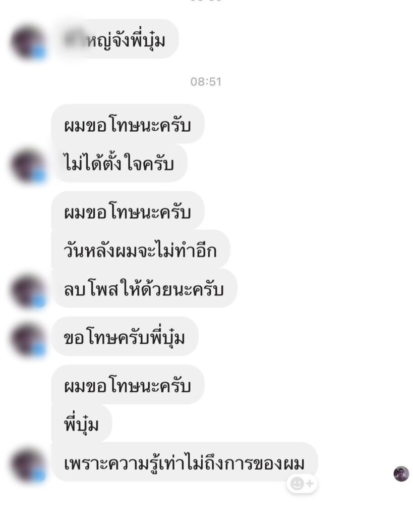 และหลังจากที่โพสต์ไปได้ไม่ทันไร ปรากฎว่าหนุ่มคู่กรณีคนดังกล่างรีบส่งข้อความเข้ามาขอโทษสาวบุ๋ม บอกรู้เท่าไม่ถึงการณ์ และวอนให้ลบโพสต์ทิ้ง