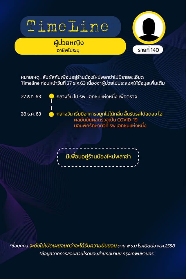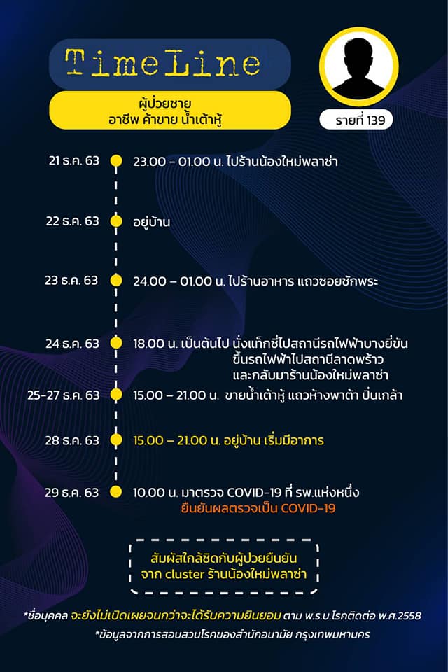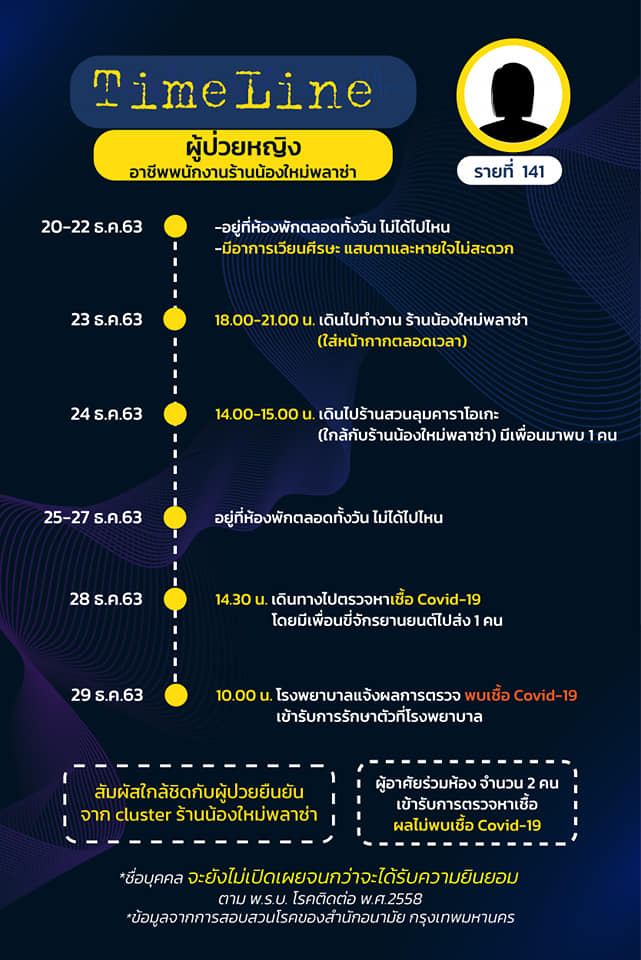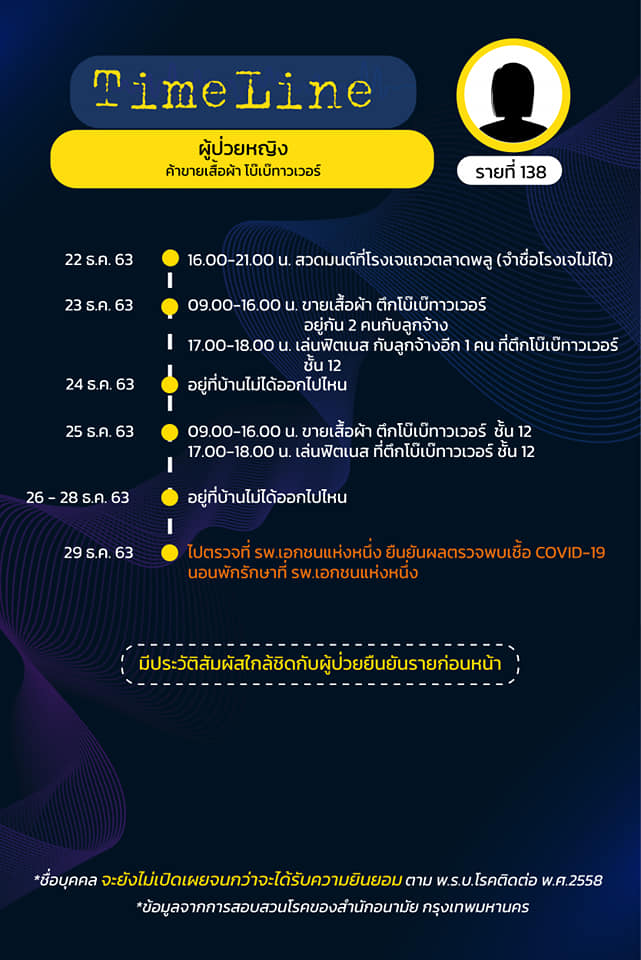 ร.ต.อ.พงศกร ขวัญเมือง โฆษกของกรุงเทพมหานคร เผยสรุปยอดผู้ติดเชื้อโควิด-19 ในพื้นที่กรุงเทพฯ ตั้งแต่วันที่ 20 ธ.ค. 63 – 2 ม.ค. 64 รวมจำนวน 182 ราย แยกเป็นคนต่างจังหวัดที่เข้ามารักษาตัวที่โรงพยาบาลในพื้นที่ กทม. 43 ราย และเป็นคนที่อยู่ในพื้นที่ กทม. 139 คน ซึ่งจากการสอบสวนโรคพบเป็นการติดเชื้อในประเทศที่มีประวัติเชื่อมโยงกับ จ.สมุทรสาคร จ.ระยอง และการไปสถานบันเทิง สถานที่ชุมชน สถานที่ แออัด กลุ่มอาชีพเสี่ยง และสัมผัสผู้ป่วยยืนยันก่อนหน้านี้ ส่วนข้อมูลการสอบสวนโรค พบว่าได้แถลง Timeline ของผู้ติดเชื้อไปแล้วจำนวน 125 ราย คือช่วงวันที่ 20 ธ.ค.ถึง 30 ธ.ค. ส่วน Timeline ของผู้ติดเชื้อ ในวันที่ 31 ธ.ค. 63 จำนวน 19 ราย นั้น พบว่า สอบสวนโรคเสร็จเรียบร้อยเพิ่มอีก 17 ราย เป็นคนต่างจังหวัดที่ Admit รพ.ในพื้นที่ กทม. 2 ราย และยังอยู่ระหว่างสอบสวนโรค อีก 38 ราย