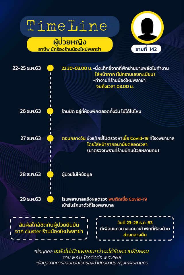 ร.ต.อ.พงศกร ขวัญเมือง โฆษกของกรุงเทพมหานคร เผยสรุปยอดผู้ติดเชื้อโควิด-19 ในพื้นที่กรุงเทพฯ ตั้งแต่วันที่ 20 ธ.ค. 63 – 2 ม.ค. 64 รวมจำนวน 182 ราย แยกเป็นคนต่างจังหวัดที่เข้ามารักษาตัวที่โรงพยาบาลในพื้นที่ กทม. 43 ราย และเป็นคนที่อยู่ในพื้นที่ กทม. 139 คน ซึ่งจากการสอบสวนโรคพบเป็นการติดเชื้อในประเทศที่มีประวัติเชื่อมโยงกับ จ.สมุทรสาคร จ.ระยอง และการไปสถานบันเทิง สถานที่ชุมชน สถานที่ แออัด กลุ่มอาชีพเสี่ยง และสัมผัสผู้ป่วยยืนยันก่อนหน้านี้ ส่วนข้อมูลการสอบสวนโรค พบว่าได้แถลง Timeline ของผู้ติดเชื้อไปแล้วจำนวน 125 ราย คือช่วงวันที่ 20 ธ.ค.ถึง 30 ธ.ค. ส่วน Timeline ของผู้ติดเชื้อ ในวันที่ 31 ธ.ค. 63 จำนวน 19 ราย นั้น พบว่า สอบสวนโรคเสร็จเรียบร้อยเพิ่มอีก 17 ราย เป็นคนต่างจังหวัดที่ Admit รพ.ในพื้นที่ กทม. 2 ราย และยังอยู่ระหว่างสอบสวนโรค อีก 38 ราย