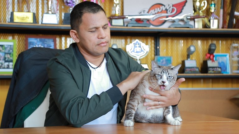 “ ผมเป็นคนรักแมวมากๆ ครับ ตอนนี้มีทั้งหมด 4 ตัว เมื่อก่อนมีเยอะกว่านี้ครับ คือที่เลี้ยงตอนแรกไปเจอแมวเร่ร่อนก็สงสารเลยเอามาเลี้ยงไว้ แล้วพอเค้าตายไป ก็ไปได้สายพันธุ์เบงกอลมา 2 ตัว คือ ขนเงิน และพันล้าน ตอนหลังเจ้าพันล้านหายตัวไป เหลือเจ้า ขนเงิน ตัวเดียว แล้วเค้าก็มีลูก วันนี้ที่พามาออกรายการมี 2 ตัว ชื่อ น้องชูก้า อายุประมาณ 5 ขวบ เป็นสายพันธุ์วิเชียรมาศผสมเบงกอล และอีกตัวคือเจ้า ขนเงินพ่อของน้องชูก้า เป็นแมวสายดื้อชอบออกไปข้างนอกไม่อยู่กับที่ แล้วที่เลี้ยงมาแต่ละตัวก็ชอบหนีออกจากบ้าน