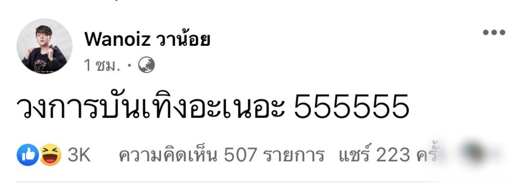 นอกจากนี้ วาน้อย ยังมีการโพสต์อีกข้อความลงเพจเฟซบุ๊คอีกว่า “วงการบันเทิงอะเนอะ 555555″