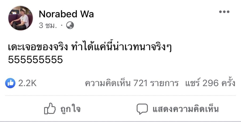 ล่าสุดทางด้านฝ่ายชายก็มีการเคลื่อนไหว โพสต์ข้อความลงเฟซบุ๊คระบุว่า “เดะเจอของจริง ทำได้แค่นี้น่าเวทนาจริงๆ