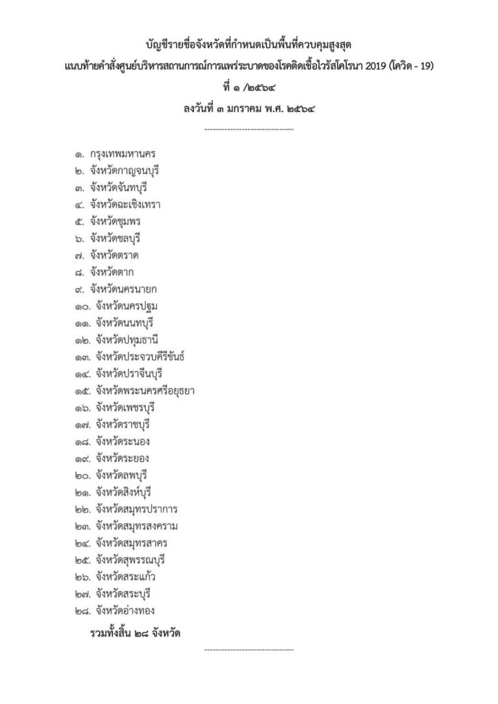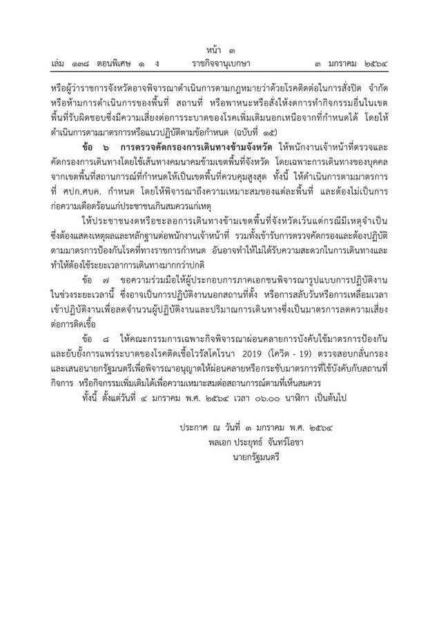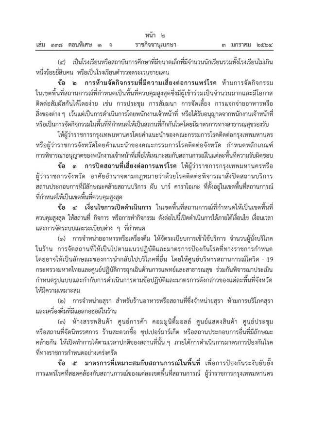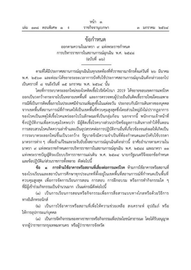 ราชกิจจานุเบกษาออกประกาศตามความในมาตรา 9 แห่งพระราชกำหนดการบริหารสถานการณ์ฉุกเฉิน ฉบับที่ 16 หลังพบมีผู้ติดเชื้อบางส่วนปกปิดข้อมูลการเดินทางทำให้ขั้นตอนการสอบสวนโรคเกิดความล่าช้า และเป็นอุปสรรคต่อการปฏิบัติงาน ส่งผลให้เกิดการระบาดระลอกใหม่เป็นวงกว้าง รัฐบาลจึงบังคับใช้กฎหมายและออกข้อกำหนดรวมถึงข้อปฏิบัติแก่ส่วนราชการ ห้ามใช้อาคารหรือสถานที่เสี่ยงต่อการแพร่กระจายโรค โดยเฉพาะอาคารเรียน สถาบันการศึกษาทุก ประเภทที่ตั้งอยู่ในพื้นที่ควบคุมสูงสุด ห้ามจัดกิจกรรมที่มีความเสี่ยงต่อการแพร่ระบาดของโรค เช่นการประชุมสัมมนา จัดเลี้ยง แจกจ่ายอาหารหรือสิ่งของต่างๆ เว้นแต่ได้รับการอนุญาตจากเจ้าหน้าที่ให้ปิดพื้นที่เสี่ยง สถานประกอบการที่คล้ายกับสถานบริการ ผับ บาร์ คาราโอเกะ ในพื้นที่ควบคุมสูงสุด ส่วนในพื้นที่ควบคุมสูงสุดสามารถจำหน่ายอาหารและเครื่องดื่มได้ แต่ไม่อนุญาตให้นั่งกินในร้าน สามารถจำหน่ายสุราให้นำกลับบ้านได้ห้ามบริโภคในร้าน ส่วนห้างสรรพสินค้า ศูนย์การค้า คอมมิวนิตี้มอลล์ศูนย์ประชุม สถานที่จัดนิทรรศการ ร้านสะดวกซื้อ ยังสามารถเปิดบริการได้ตามปกติ แต่จะต้องมีมาตรการป้องกันโรคอย่างเคร่งครัด ส่วนการเดินทางข้ามจังหวัดให้เจ้าหน้าที่ตรวจคัดกรอง โดยให้มีผลทันทีตั้งแต่วันจันทร์ที่ 4 มกราคม 2564 เวลา 06:00 น. เป็นต้นไป พร้อมกันนี้ยังได้มีการประกาศบัญชีรายชื่อจังหวัดที่กำหนดให้เป็นพื้นที่ควบคุมสูงสุดไว้จำนวน 28 จังหวัดด้วย