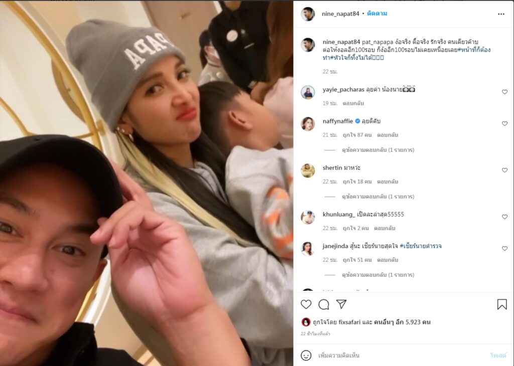 ล่าสุด ร.ต.ต.นาย ณภัทร ได้โพสต์รูปรวมสามคนพร้อมประกาศออกสื่อเดินหน้าจีบเต็มที่ว่า “pat_napapa ง้อจริง ตื้อจริง รักจริง คนเดียวค๊าบ ต่อให้งอนอีก 100 รอบ ก็ง้ออีก 100 รอบไม่เคยเหนื่อยเลย #หน้าที่ก็ต้องทำ #หัวใจก็ทิ้งไม่ได้”
