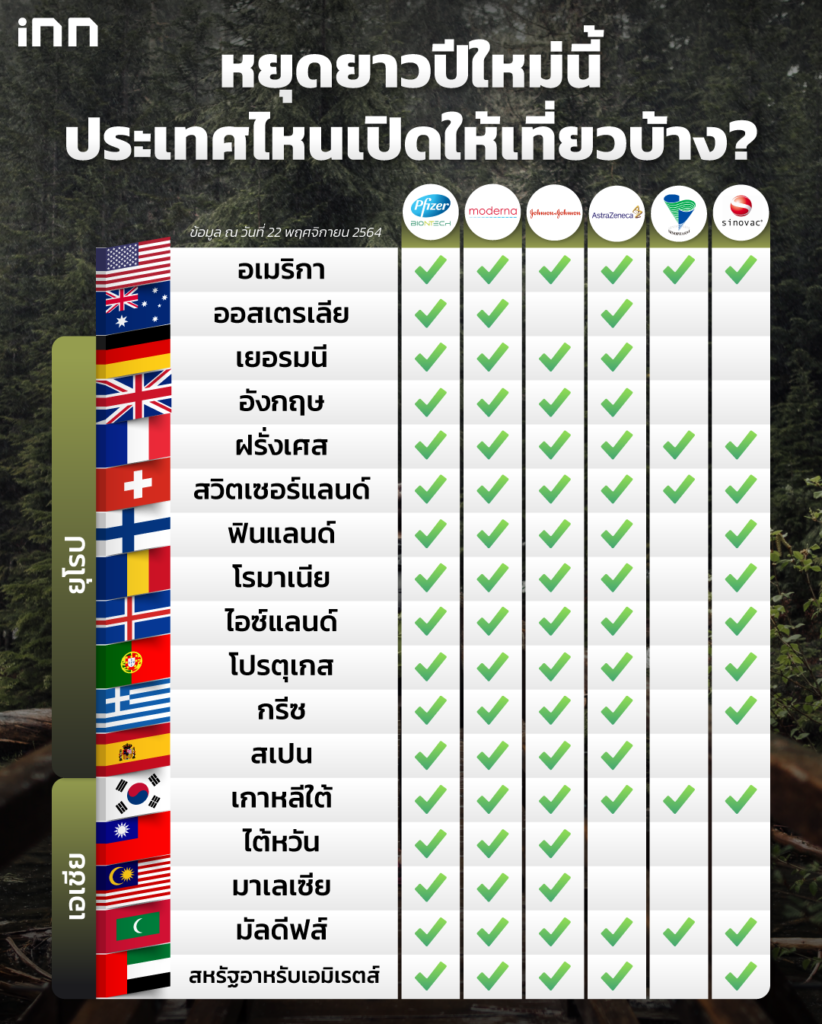 ก่อนจะไปเที่ยวต่างประเทศ ไม่ว่าจะเป็นประเทศไหนๆ ก็ควรเช็กกันก่อนว่าตัวเราฉีดวัคซีนชนิดไหนมา แล้วประเทศที่อยากไปรองรับวัคซีนชนิดนั้นหรือเปล่า และก็อย่าลืมตรวจสอบมาตรการต่างๆให้ดีก่อน แล้วพอไปเที่ยวอย่าลืมสวมหน้ากากและล้างมือบ่อยๆด้วยนะ หากใครอยากวางแพลนทริปเที่ยวปีใหม่ที่อื่นล่ะก็มาอ่านต่อได้เลยที่ iNN Lifestyle