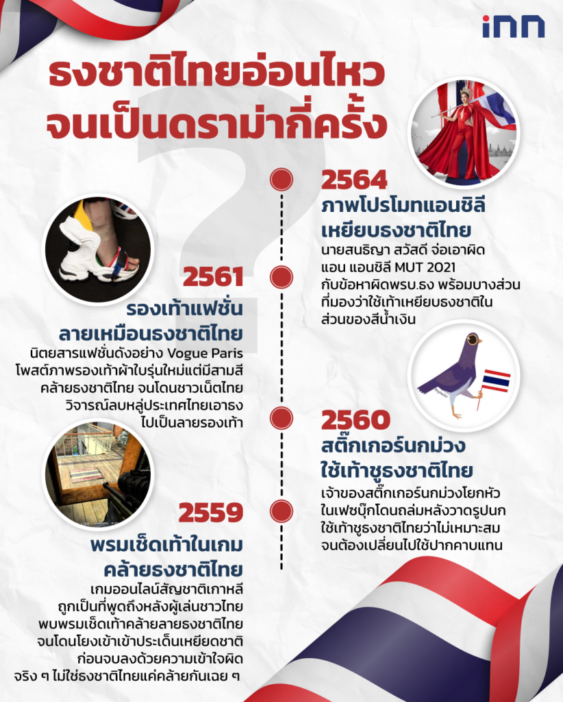 นับเป็นของคู่กันของประเทศไทยกับความอ่อนไหวของชาตินิยมที่มีให้เห็นอยู่อย่างต่อเนื่อง กับดราม่าล่าสุดที่ตัวแทนสาวไทยไปแข่งศึกชิงนางงามจักรวาลด้วยภาพโปรโมทสาวแอน แอนชิลี สก็อต-เคมมิส ที่โดนวิพากษ์วิจารณ์กับการเหยียบไตรรงค์ มาดูกันว่าก่อนหน้านี้ไทยแลนด์เคยอ่อนไหวกับธงชาติไทยมาแล้วกี่ครั้งกัน