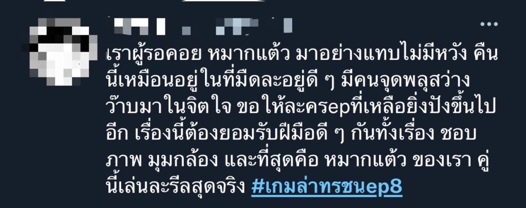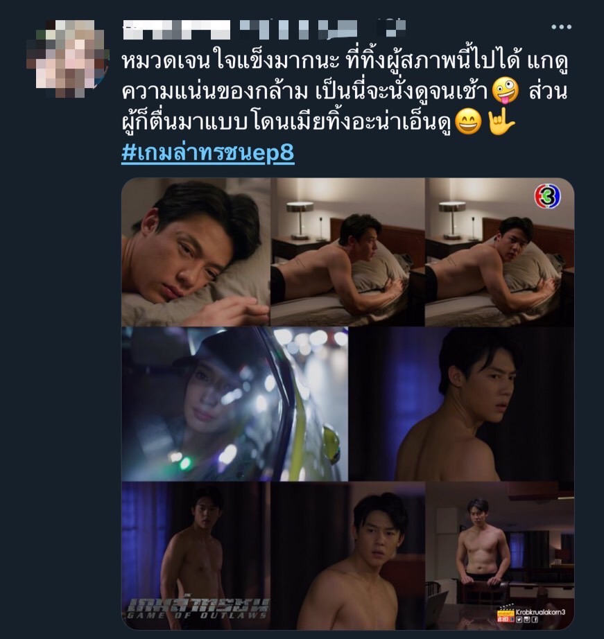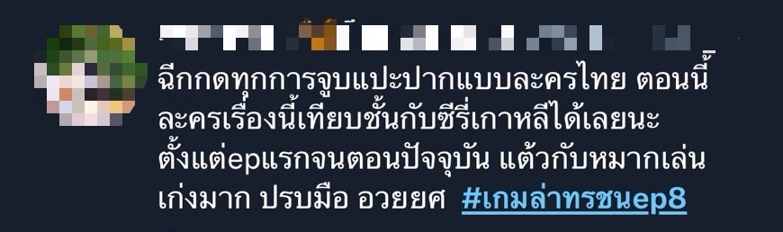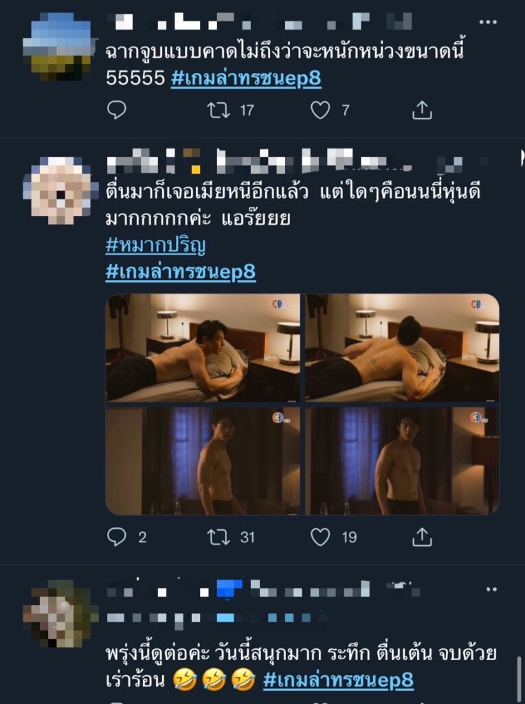 บู๊ว่าเดือดแล้วเลิฟซีนเดือดยิ่งกว่า สำหรับละครที่ยากจะคาดเดา “เกมล่าทรชน” ทางช่อง3จากค่าย เมตตาและมหานิยม โดยผู้จัด-ผู้กำกับ นก ฉัตรชัย เปล่งพานิช ใน EP. 8 . วันพุธ 24 พฤศจิกายน 2564 ที่ทั้งแซ่บ เผ็ด เด็ด มันส์ เกินจะบรรยาย ไม่ว่าจะเป็น เกมล่า หรือ เกมรัก ก็ยกให้ 10 เต็ม10 โดยเฉพาะฉากเลิฟซีนของ พระเอกหนุ่มแซ่บ หมาก ปริญ สุภารัตน์ และ แต้ว ณฐพร เตมีรักษ์ ที่เห็นแล้วร้องกรี๊ด เพราะเล่นจริง จูบจริง บรรยากาศยังส่ง แสงได้ ภาพสวย เพลงยังอิน จนต้องขอยกนิ้วชม การันตีเคมีถูกคู่ด้วยความร้อนแรงบนโลกโซเชียล