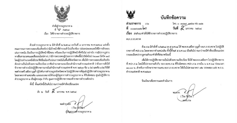 ใจความว่า ด้วยตำรวจภูธรภาค 2 มีคำสั่งที่ 2/2564 ลงวันที่ 3 มกราคม พ.ศ. 2564 แต่งตั้งคณะกรรมการตรวจสอบข้อเท็จจริงว่ามีเจ้าหน้าที่ตำรวจเข้าไปเกี่ยวข้องปล่อยปละละเลยให้มีการลักลอบเล่นการพนันถือเป็นการปฏิบัติหน้าที่มิชอบหรือละเว้นการปฏิบัติหน้าที่หรือไม่อย่างไร กรณีปรากฏข่าวทางสื่อสารมวลชนและสื่อออนไลน์ต่างๆ ว่ามีการตรวจพบผู้ป่วยจากการติดเชื้อไวรัสโคโรน่า 2019 (โควิด 19) โดยผู้ป่วยจำนวนหนึ่งมีประวัติเชื่อมโยงกับบ่อนการพนันในพื้นที่จังหวัดตราด เพื่อให้การตรวจสอบข้อเท็จจริงดังกล่าวเป็นไปด้วยความเรียบร้อย อาศัยอำนาจตามระเบียบสำนักงานตำรวจแห่งชาติว่าด้วยการสั่งให้ข้าราชการตำรวจไปปฏิบัติราชการภายในสำนักงานตำรวจแห่งชาติ พ.ศ. 2563 ข้อ 6(2) และข้อ 8(2) จึงให้ พล.ต.ต.เสถียร บุญค้ำ ผู้บังคับการตำรวจภูธรจังหวัดตราด ไปปฏิบัติราชการที่ศูนย์ปฏิบัติการตำรวจภูธรภาค 2 โดยขาดจากตำแหน่งเดิมและมอบหมายให้รองผู้บัญชาการตำรวจภูธรภาค 2 ที่รับผิดชอบศูนย์ปฏิบัติการตำรวจภูธรภาค 2 เป็นผู้ควบคุมกำกับดูแลการปฏิบัติราชการของข้าราชการตำรวจดังกล่าว ทั้งนี้ตั้งแต่บัดนี้เป็นต้นไปจนกว่าจะมีคำสั่งเปลี่ยนแปลง
