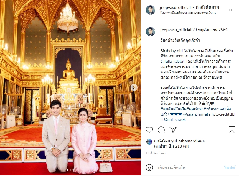 ส่วนทางด้าน จิ๊บ วสุ  ก็ได้โพสต์อินสตาแกรมด้วยว่า “วันคล้ายวันเกิดคุณจ๊ะจ๋า Birthday girl ได้รับโอกาสที่เป็นมงคลยิ่งกับชีวิต ได้เข้าเฝ้าถวายสักการะและรับประทานพร จาก เจ้าพระคุณสมเด็จพระอริยวงศาคตญาณ สมเด็จพระสังฆราช สกลมหาสังฆปริณายก ณ วัดราชบพิธ รวมทั้งได้รับโอกาสให้เข้ากราบสักการะภายในของพระเจดีย์ พระวิหาร และโบสถ์ ที่ศักดิ์สิทธิ์และสวยงามอย่างยิ่ง นับเป็นบุญกับชีวิตอย่างสูงครับ”