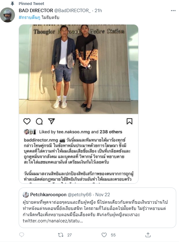 ล่าสุด ต้อม ยุทธเลิศ โพสต์ภาพไปสถานีตำรวจพร้อมทนาย เตรียมฟ้องหมิ่นประมาท ซึ่งในโพสต์ได้อ้างอิงทวีตของ เพชร กรุณพล พร้อมแคปชั่นว่า “#กราบตีนกู ไม่รับครับ“