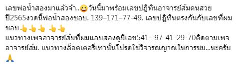 มาที่คนแรกกันเลยบอกเลยว่าปังแทบทุกงวด สำหรับนักลูกทุ่งหนุ่มลูกคอ9ชั้นอย่าง “มนต์สิทธิ์ คำสร้อย” คู่แข่งตัวจริงของแม่น้ำหนึ่ง ซึ่งงวดนี้เจ้าตัวก็ไม่พลาดมีเลขเด็ดมาฝากแฟนๆได้ลุ้นกันอีกแล้ว หลังได้ออกมาโพสต์ระบุข้อความว่า “เลขพ่อน้ำสองมาแล้วจ้า..วันนี้มาพร้อมเลขปฎิทินอาจารย์ส้มคนสวยปี2565งวดนี้พ่อน้ำสองชอบ. 139–171–77-49. เลขปฎิทินตรงกันกับเลขที่ผมชอบ แนวทางเพจอาจารย์ส้มที่ผมแอบส่องดูมีเลข541– 97-41-29-70 ติดตามเพจอาจารย์ส้ม. แนวทางล็อตเตอรี่เท่านั้นโปรดใช้วิจารณญาณในการชม…นะครับ”
