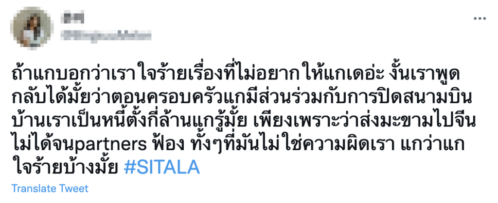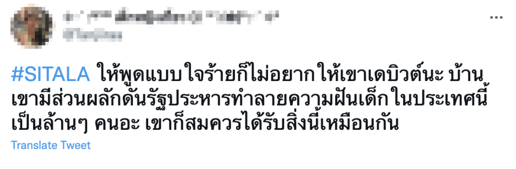 อีกทั้งยังมีหลายคอมเมนต์ที่กล่าวว่าพ่อของเธอทำให้ประเทศถดถอยลงและตามมาด้วยวิกฤติเศรฐกิจ ภายใต้ #SITALA  #แบนลูกหนัง บนทวิตเตอร์และเฟซบุ๊ก