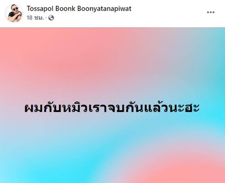 แต่ล่าสุดความสัมพันธ์ของทั้งดูเหมือนจะมีปัญหา เมื่อหนุ่มบุ๊ง ได้ออกมาโพสต์ข้อความลงเฟซบุ๊คส่วนตัวว่า