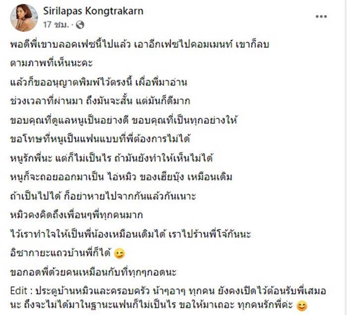 “ผมกับหมิวเราจบกันแล้วนะฮะ”ส่วน “หมิว” ก็ได้เขียนข้อความระบายความในใจถึงอดีตแฟนหนุ่มว่า… “พอดีพี่เขาบลอคเฟซนี้ไปแล้ว เอาอีกเฟซไปคอมเมนท์ เขาก็ลบ ตามภาพที่เห็นนะคะ แล้วก็ขออนุญาตพิมพ์ไว้ตรงนี้ เผื่อพี่มาอ่าน