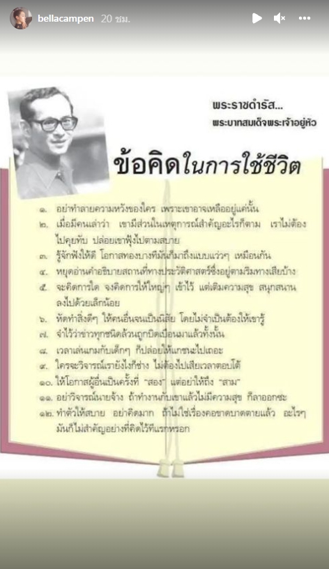 ล่าสุดสาว “เบลล่า ราณี” ได้เคลื่อนไหวอีกครั้ง โดยได้โพสต์แชร์ ข้อคิดในการใช้ชีวิต ของในหลวง ร.9 ซึ่งมีทั้งหมด 12 ข้อในสตอรี่ไอจี ระบุดังนี้