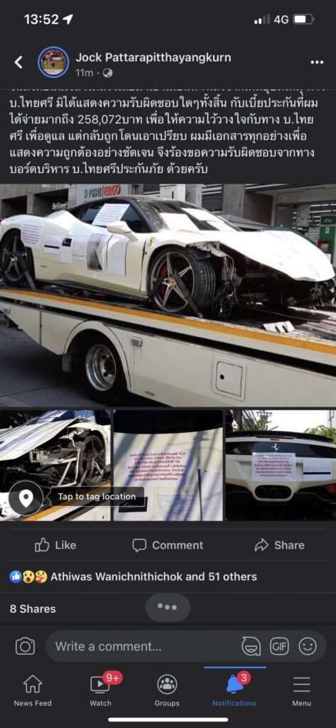 โดยเรื่องราวทั้งหมดเกิดจาก รถได้เกิดอุบัติเหตุขึ้นที่ถนนมอเตอร์เวย์ แต่งานนี้หนุ่มคนดังกล่าวอ้างว่าประกันไม่ยอมรับผิดชอบ ทำเอาผู้ใช้เฟสบุ๊ครายนี้เดือดสุดๆ เพราะอุบัติเหตุนี้เกิดตั้งแต่เดือน 28 สิงหาคม 2564 จนถึงปัจจุบัน เป็นเวลา 3-4 เดือน ยังไม่ได้รับความเป็นธรรมจากประกัน