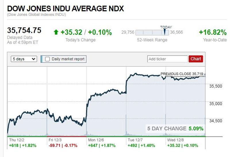 บรรยากาศการลงทุนในตลาดหุ้นสหรัฐเมื่อคืนที่ผ่านมา (8 ธ.ค.) ดาวโจนส์ปิดบวกขานรับรายงานที่ว่าวัคซีนของบริษัทไฟเซอร์และไบออนเทคจำนวน 3 โดสมีประสิทธิภาพสูงในการสร้างภูมิต้านทานไวรัสโควิด-19 สายพันธุ์โอมิครอน โดยข่าวดังกล่าวช่วยหนุนที่ได้ประโยชน์จากการเปิดเศรษฐกิจ ซึ่งรวมถึงหุ้นกลุ่มสายการบินและกลุ่มเรือสำราญ