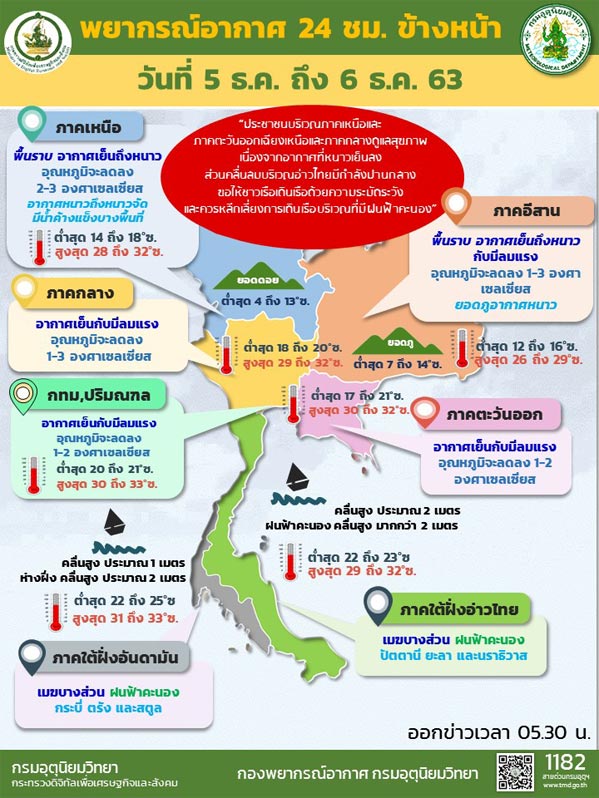 กรมอุตุนิยมวิทยา พยากรณ์อากาศ 24 ชั่วโมงข้างหน้า บริเวณความกดอากาศสูงหรือมวลอากาศเย็นกำลังแรงจากประเทศจีนแผ่ปกคลุมประเทศไทยตอนบน ลักษณะเช่นนี้ทำให้ประเทศไทยตอนบนมีอากาศเย็นถึงหนาว กับมีลมแรง และอุณหภูมิจะลดลง 2-4 องศาเซลเซียส ส่วนยอดดอยและยอดภูมีอากาศหนาวถึงหนาวจัดและมีน้ำค้างแข็งบางพื้นที่ ขอให้ประชาชนบริเวณดังกล่าว ดูแลสุขภาพเนื่องจากสภาพอากาศที่หนาวเย็นลงไว้ด้วย สำหรับมรสุมตะวันออกเฉียงเหนือที่พัดปกคลุมอ่าวไทยและภาคใต้มีกำลังอ่อนลง ทำให้บริเวณภาคใต้มีฝนลดลง ส่วนคลื่นลมบริเวณอ่าวไทยมีกำลังปานกลาง โดยมีคลื่นสูงประมาณ 2 เมตร บริเวณที่มีฝนฟ้าคะนองคลื่นสูงมากกว่า 2 เมตร ขอให้ชาวเรือบริเวณดังกล่าวเดินเรือด้วยความระมัดระวัง และควรหลีกเลี่ยงเดินเรือบริเวณที่มีฝนฟ้าคะนอง สำหรับกรุงเทพฯ และปริมณฑล มีอากาศเย็น กับมีลมแรง อุณหภูมิจะลดลง 1-2 องศาเซลเซียส อุณหภูมิต่ำสุด 20-21 องศาเซลเซียส อุณหภูมิสูงสุด 30-33 องศาเซลเซียส ลมตะวันออกเฉียงเหนือ ความเร็ว 15-30 กม./ชม.
