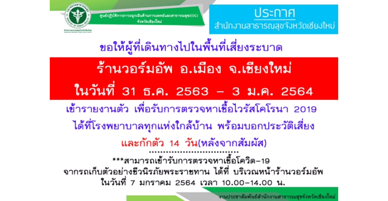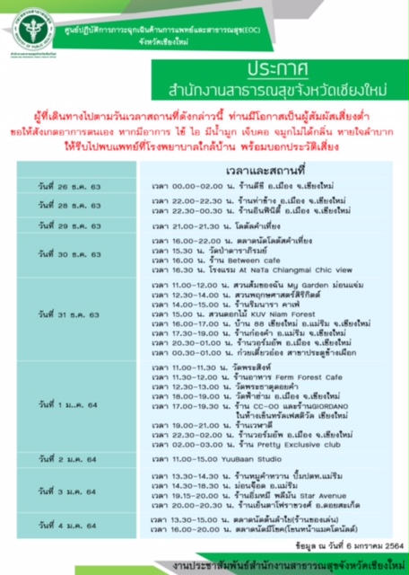 สำหรับไทม์ไลน์ของผู้ป่วยจะพบว่า ผู้ติดเชื้อทุกรายมีการเชื่อมโยงกับผู้ป่วยรายก่อนหน้านี้ ซึ่งจะพบว่าการระบาดเกิดขึ้นในคืน วันที่ 31 ธ.ค. 63 ในสถานบันเทิง ซึ่งคณะกรรมการโรคติดต่อจังหวัดได้มีมาตรการให้ปิดสถานบริการ หรือสถานประกอบการที่มีลักษณะคล้ายสถานบริการ ผับ บาร์ คาราโอเกะ ทุกแห่งในจังหวัดเชียงใหม่ เป็นระยะเวลา 14 วัน เพื่อป้องกันมิให้มีการแพร่ระบาดต่อเนื่องไปยังสถานที่อื่นๆ รวมถึงในชุมชน ทั้งนี้ประชาชนที่ได้เดินทางไปยัง ร้านวอร์มอัพ ระหว่างวันที่ 31 ธ.ค. 63 – 3 ม.ค. 64 ซึ่งถือเป็นผู้สัมผัสเสี่ยงสูง สามารถเข้ารับการตรวจหาเชื้อไวรัสโคโรนา 2019 ได้ ณ รถเก็บตัวอย่างชีวนิรภัยพระราชทาน ที่หน้าร้านวอร์มอัพ ในวันพรุ่งนี้ (7 ม.ค. 64) ช่วงเวลา 10.00-14.00 น. โดยผู้สัมผัสใกล้ชิดเสี่ยงสูงจะต้องกักกันตนเอง แสดงตัวต่อเจ้าหน้าที่เพื่อเข้ารับการตรวจ และให้ประวัติที่เป็นจริง เพื่อมิให้มีการระบาดเพิ่มเติมไปยังสถานที่อื่นๆ