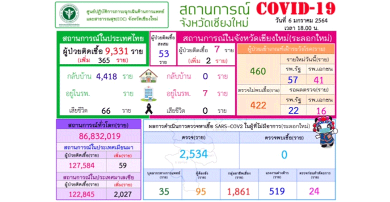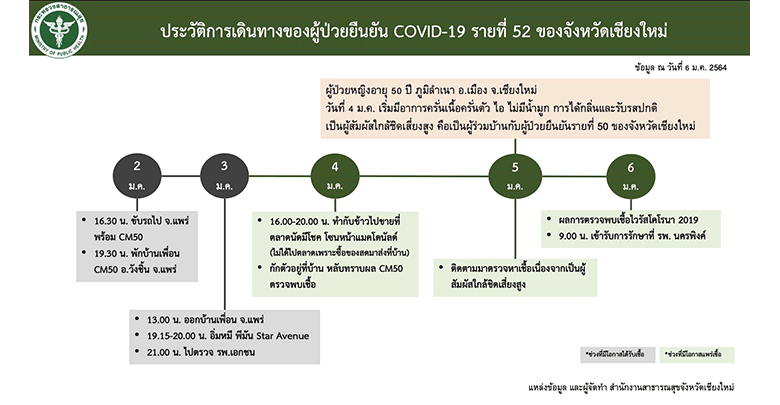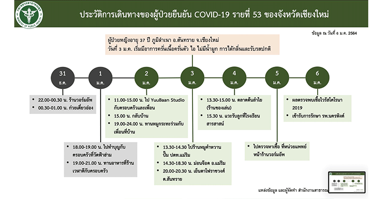 “สำหรับวันนี้พบผู้ป่วยโควิด-19 อีก 2 ราย คือรายที่ 52 ของจังหวัดเชียงใหม่ พบเป็น หญิงไทย อายุ 50 ปี ภูมิลำเนา อ.เมือง จ.เชียงใหม่ วันที่ 4 ม.ค. เริ่มมีอาการครั่นเนื้อครั่นตัว ไอ ไม่มีน้ำมูก การได้กลิ่นและรับรสปกติ เป็นผู้สัมผัสร่วมบ้านของผู้ป่วยโควิด-19 รายที่ 50 จังหวัดเชียงใหม่ และ รายที่ 53 ของจังหวัดเชียงใหม่ หญิงไทย อายุ 37 ปี ภูมิลำเนา อ.สันทราย จ.เชียงใหม่ วันที่ 3 ม.ค. เริ่มมีอาการครั่นเนื้อครั่นตัว ไอ ไม่มีน้ำมูก การได้กลิ่นและรับรสปกติ ประวัติเดินทางไปในร้านวอร์มอัพ ในคืนวันที่ 31 ธ.ค. 63” นพ.กิตติพันธุ์ กล่าว