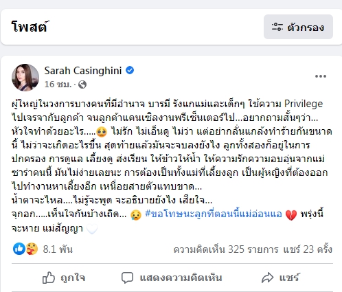 “ผู้ใหญ่ในวงการบางคนที่มีอำนาจ บารมี รังแกแม่และเด็กๆ ใช้ความ Privilege ไปเจรจากับลูกค้า จนลูกค้าแคนเซิลงานพรีเซ็นเตอร์ไป…อยากถามสั้นๆ ว่า…หัวใจทำด้วยอะไร… ไม่รัก ไม่เอ็นดู ไม่ว่า แต่อย่ากลั่นแกล้งทำร้ายกันขนาดนี้ ไม่ว่าจะเกิดอะไรขึ้น สุดท้ายแล้วมันจะจบลงยังไง ลูกทั้งสองก็อยู่ในการปกครอง การดูแล เลี้ยงดู ส่งเรียน ให้ข้าวให้น้ำ ให้ความรักความอบอุ่นจากแม่ซาร่าคนนี้ มันไม่ง่ายเลยนะ การต้องเป็นทั้งแม่ที่เลี้ยงลูก เป็นผู้หญิงที่ต้องออกไปทำงานหาเลี้ยงอีก เหนื่อยสายตัวแทบขาด น้ำตาจะไหล ไม่รู้จะพูด จะอธิบายยังไง เสียใจ จุกอก..เห็นใจกันบ้างเถิด #ขอโทษนะลูกที่ตอนนี้แม่อ่อนแอ พรุ่งนี้จะหาย แม่สัญญา”