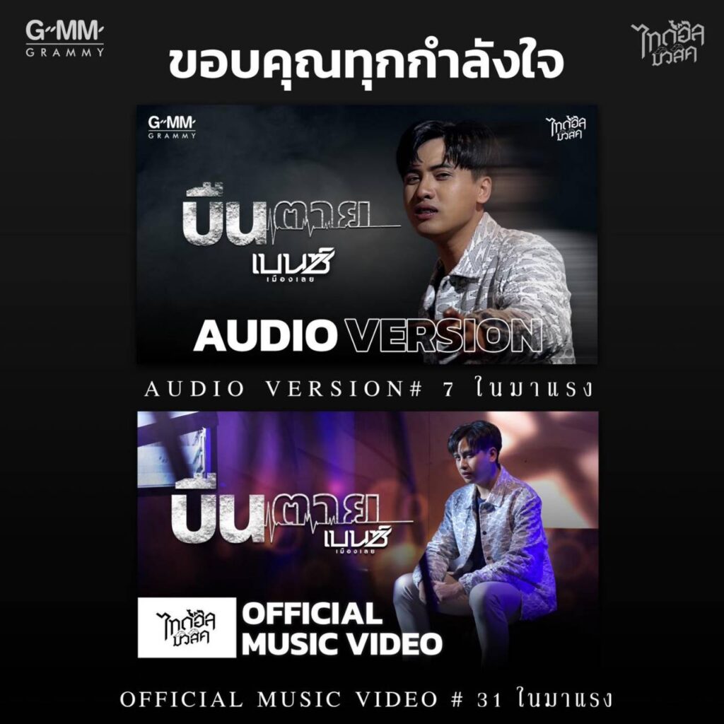 เพิ่งจะปล่อยซิงเกิลล่าสุด “#บืนตาย” ไปได้แค่ไม่ถึง 48 ชั่วโมง ก็ทำเอาเจ้าของเพลงสุดหล่อ “#เบนซ์เมืองเลย” ยิ้มสุด ฟินสุด กันแล้วค่ะทุกคน เพราะได้รับฟีดแบคดีเกินคาดจากแฟนๆ ทั้งตัว Audio Versions ที่ปล่อยไปก่อนหน้านี้ได้ไม่กี่ชั่วโมง ก็ติด #7ในมาแรง และเมื่อมิวสิควิดีโอปล่อยมาอีกก็ติดเทรนด์ #31ในมาแรง เข้าไปอี๊ก ทำเอา #เบนซ์เมืองเลย หายเหนื่อยเป็นปลิดทิ้ง เพราะเอ็มวีเพลง #บืนตาย นี้บอกได้คำเดียวว่า พ่แหนุ่มเบนซ์ฮีสะบักสะบอมพอสมควร กว่าจะผ่านได้แต่ละฉาก แต่ละตอน หลายเทคพอตัว จนเป็นลมคากองเอ็มวีกันมาแล้ว เรียกได้ว่า “บืนตาย” พาฟินไปกันเลย