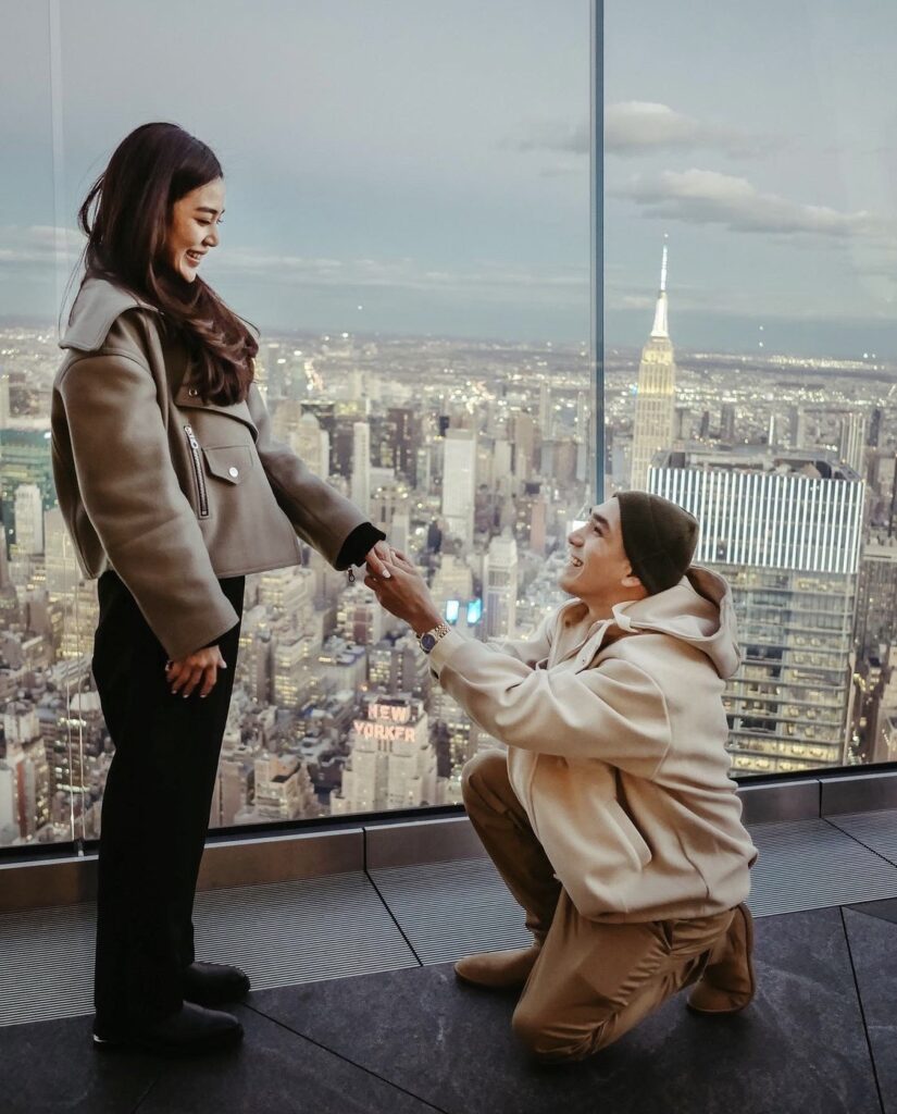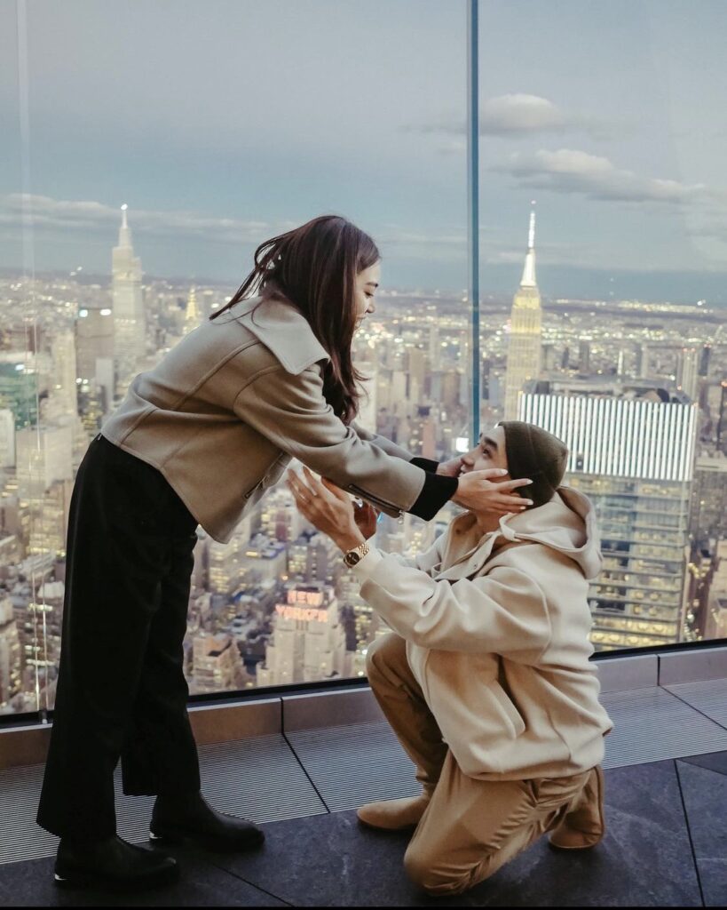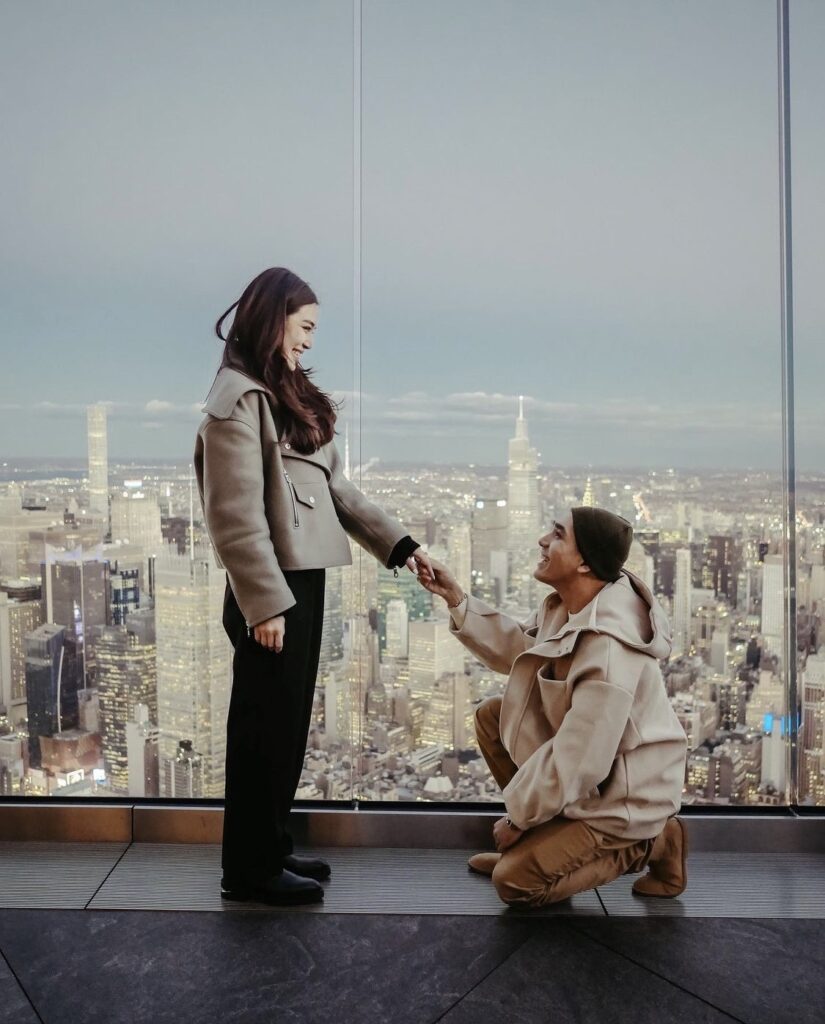 “ไม่เลย ตึกที่เขาขึ้นไปขอแต่งงานคือตอนแรกหนูจะไม่ขึ้นไปด้วย(หัวเราะ) เพราะว่ามันหนาวมาก เลยบอกว่าโต้งไปถ่ายที่อื่นกันไหม มันมีที่สวยๆ อีกเยอะเลย จะเทอยู่แล้วเพราะมันหนาวมากไม่ไหว แต่เขาก็บอกว่าลองขึ้นไปก่อนมันสวยมากเลยนะ ขึ้นไปแป๊บเดียวรอพระอาทิตย์ตกดิน เขาบอกด้วยว่าพี่นานาซื้อตั๋วไว้ให้ จองไว้ให้แล้ว เราก็เลยโอเค ตอนนั้นก็ยังไม่เอ๊ะหรือเอะใจอะไรเพราะมันเหนื่อยมาก แต่มาเริ่มตอนที่ทำไมพี่นานามาด้วย ตอนแรกเราไปถ่ายกันแค่ 3 คน แล้วเหมือนพี่นานาบอกว่าพี่ก็อยากขึ้นมาด้วย เราก็แบบแม่ๆ เอากล้องมาทำไมเนี่ย(หัวเราะ) พี่นานาบอกว่าแม่อยากถ่ายรูปสวยๆ ให้”