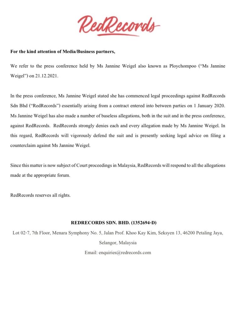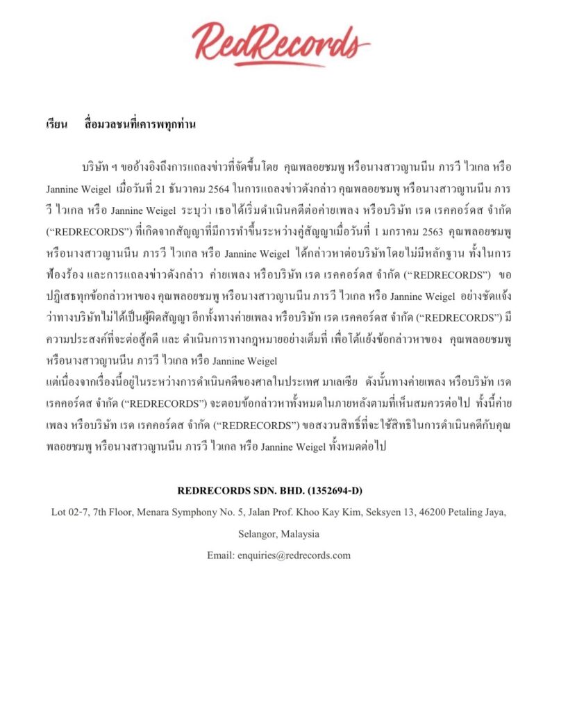 บริษัท ฯ ขออ้างอิงถึงการแถลงข่าวที่จัดขึ้นโดย คุณพลอยชมพู หรือนางสาวญานนีน ภารวี ไวเกล หรือ Jannine Weigel เมื่อวันที่ 21 ธันวาคม 2564ในการแถลงข่าวดังกล่าว คุณพลอยชมพู หรือนางสาวญานนีน ภารวี ไวเกล หรือ Jannine Weigel ระบุว่า เธอได้เริ่มดำเนินคดีต่อค่ายเพลง หรือบริษัท เรด เรคคอร์ดส จำกัด (“REDRECORDS”) ที่เกิดจากสัญญาที่มีการทำขึ้นระหว่างคู่สัญญาเมื่อวันที่ 1 มกราคม 2563 คุณพลอยชมพู หรือนางสาวญานนีน ภารวี ไวเกล หรือ Jannine Weigel ได้กล่าวหาต่อบริษัทโดยไม่มีหลักฐาน ทั้งในการฟ้องร้องและการแถลงข่าวดังกล่าว ค่ายเพลง หรือบริษัท เรด เรคคอร์ดส จำกัด (“REDRECORDS”) ขอปฏิเสธทุกข้อกล่าวหาของ คุณพลอยชมพู หรือนางสาวญานนีน ภารวี ไวเกล หรือ Jannine Weigel อย่างชัดแจ้งว่าทางบริษัทไม่ได้เป็นผู้ผิดสัญญา อีกทั้งทางค่ายเพลง หรือบริษัท เรด เรคคอร์ดส จำกัด (“REDRECORDS”) มีความประสงค์ที่จะต่อสู้คดี และ ดำเนินการทางกฎหมายอย่างเต็มที่ เพื่อโต้แย้งข้อกล่าวหาของ คุณพลอยชมพู หรือนางสาวญานนีน ภารวี ไวเกล หรือ Jannine Weigel