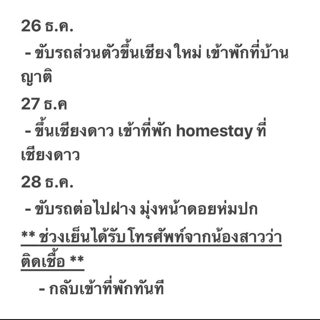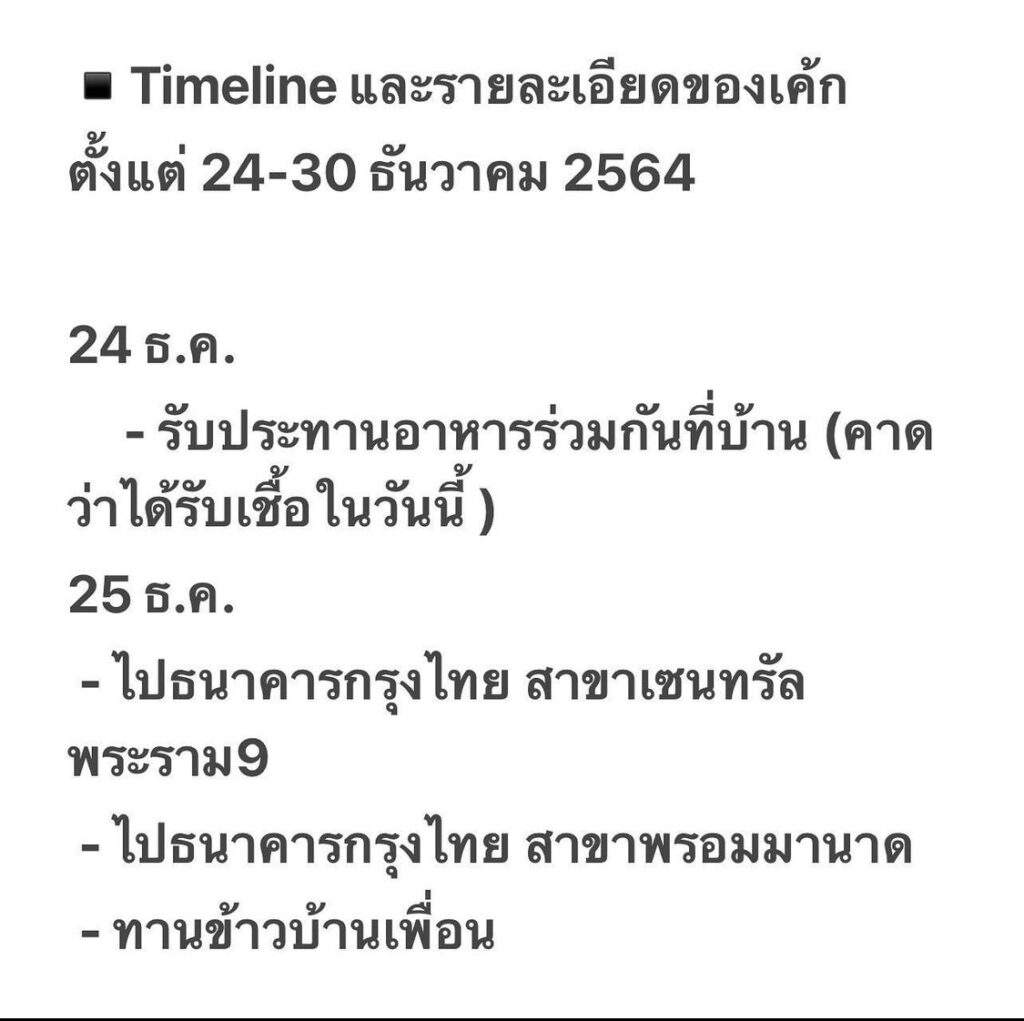 โดยในไทม์ไลน์เผยว่า ในวันที่ 24 ธันวาคม ได้มีการรับประทานข้าวด้วยกันที่บ้านและคาดง่าได้รับเชื้อในวันนี้