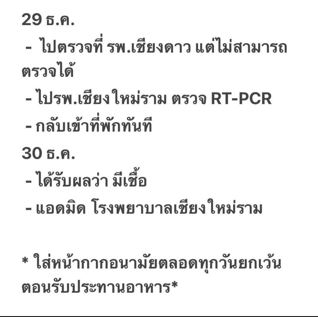 เนื่องจากเค้กได้รับทราบข่าวการติดเชื้อโควิดของน้องสาวและมีโอกาสพบกับน้องสาวมา เค้กจึงได้รีบไปทำการตรวจหาเชื้อ และ ได้ทราบผล RT-PCR ผลปรากฏว่า “ได้รับเชื้อ” โควิด ตอนนี้เข้ารับรักษาตัวอยู่ที่โรงพยาบาลเรียบร้อยแล้ว พร้อมทั้งแจง timeline ไว้อย่างละเอียด