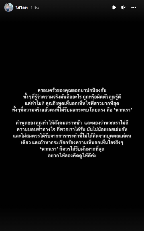 … คำพูดของคุณทำให้สังคมตราหน้า และมองว่าพวกเราไม่ดี ความบอบช้ำทางใจที่พวกเราได้รับ มันไม่น้อยเลยเช่นกัน และไม่สมควรได้รับจากการกระทำที่ไม่ได้คิดจากบุคคลแค่คนเดียว และถ้าหากจะเรียกร้องความเห็นอกเห็นใจจริง ๆ พวกเราก็ควรได้รับมันมากที่สุด อยากให้ลองคิดดูให้ดีค่ะ”