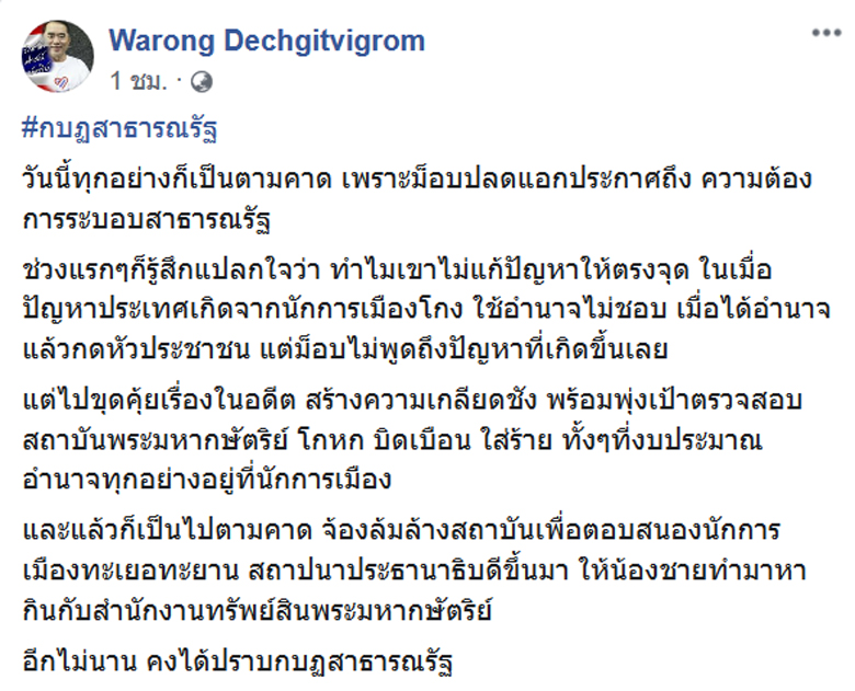 นพ.วรงค์ เดชกิจวิกรม แกนนำกลุ่มไทยภักดี ระบุข้อความผ่านเฟซบุ๊กส่วนตัว  “Warong Dechgitvigrom” โดยใช้ชื่อว่า #กบฏสาธารณรัฐ ที่มีเนื้อหาว่า วันนี้ทุกอย่างก็เป็นตามคาด เพราะม็อบปลดแอกประกาศถึง ความต้องการระบอบสาธารณรัฐ ช่วงแรกๆก็รู้สึกแปลกใจว่า ทำไมไม่แก้ปัญหาให้ตรงจุด ในเมื่อปัญหาประเทศเกิดจากนักการเมืองโกง ใช้อำนาจไม่ชอบ เมื่อได้อำนาจแล้วกดหัวประชาชน แต่ม็อบไม่พูดถึงปัญหาที่เกิดขึ้นเลย แต่ไปขุดคุ้ยเรื่องในอดีต สร้างความเกลียดชัง พร้อมพุ่งเป้าตรวจสอบสถาบันฯ โกหก บิดเบือน ใส่ร้าย ทั้งๆที่งบประมาณ อำนาจทุกอย่างอยู่ที่นักการเมือง และแล้วก็เป็นไปตามคาด จ้องล้มล้างสถาบันเพื่อตอบสนองนักการเมืองทะเยอทะยาน สถาปนาประธานาธิบดีขึ้นมา ให้น้องชายทำมาหากินกับสำนักงานทรัพย์สินฯ อีกไม่นาน คงได้ปราบกบฏสาธารณรัฐ