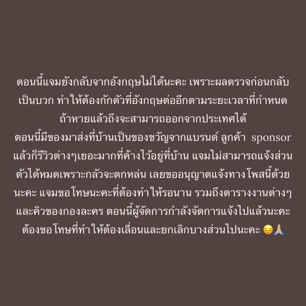 โดยแจมได้เผยว่า ยังไม่สามารถเดินทางกลับจากประเทศอังกฤษได้ เนื่องจากผลตรวจก่อนหลับเป็นบวก ทำให้ต้องกักตัวต่อที่อังกฤษจนครบตามระยะเวลาที่กำหนดและจนกว่าจะหาย พร้อมขอโทษทุกๆคนที่ได้รับผลกระทบ รวมถึงตารางงานต่างๆที่ต้องเลื่อนออกไป และต้องยกเลิกงานไปในบางส่วนด้วย