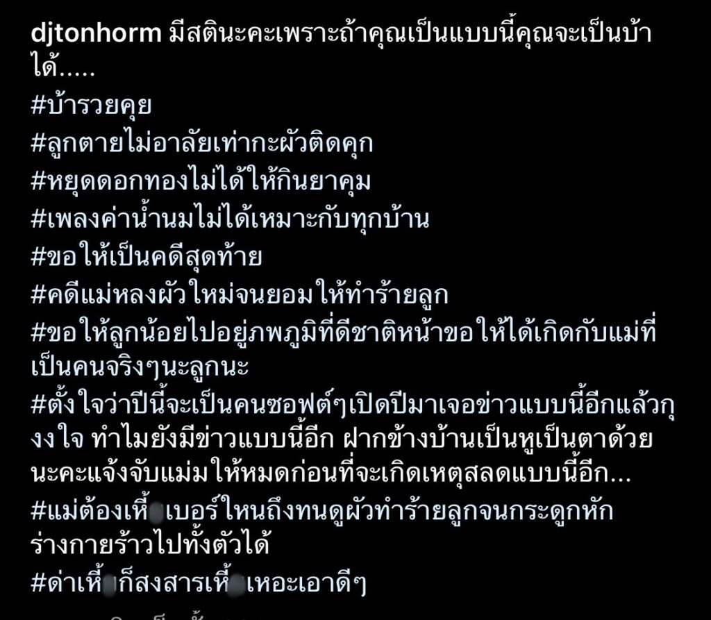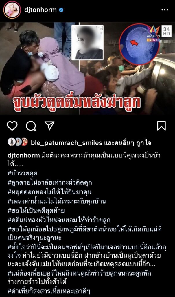 โดย “ต้นหอม ศกุนตลา” ได้มีการแชร์ภาพข่าวดังกล่าว พร้อมแนบแคปชั่นสุดเดือดว่า “มีสตินะคะเพราะถ้าคุณเป็นแบบนี้คุณจะเป็นบ้าได้….. #บ้ารวยคุย #ลูกตายไม่อาลัยเท่ากะผัวติดคุก #หยุดดอกทองไม่ได้ให้กินยาคุม #เพลงค่าน้ำนมไม่ได้เหมาะกับทุกบ้าน #ขอให้เป็นคดีสุดท้าย #คดีแม่หลงผัวใหม่จนยอมให้ทำร้ายลูก