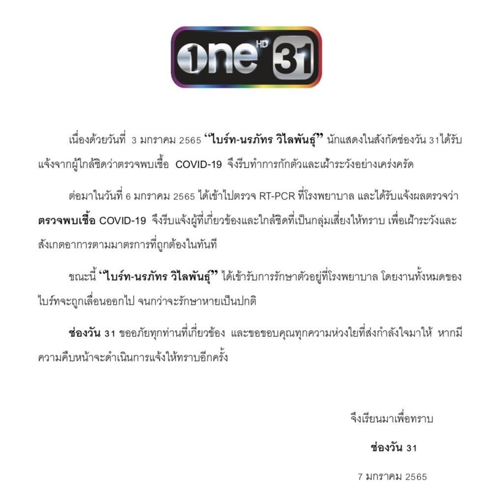 “เนื่องด้วยวันที่ 3 มกราคม 2565 “ไบร์ท-นรภัทร วิไลพันธุ์” นักแสดงในสังกัดช่องวัน 31ได้รับแจ้งจากผู้ใกล้ชิดว่าตรวจพบเชื้อ COVID-19 จึงรีบทำการกักตัวและเฝ้าระวังอย่างเคร่งครัด