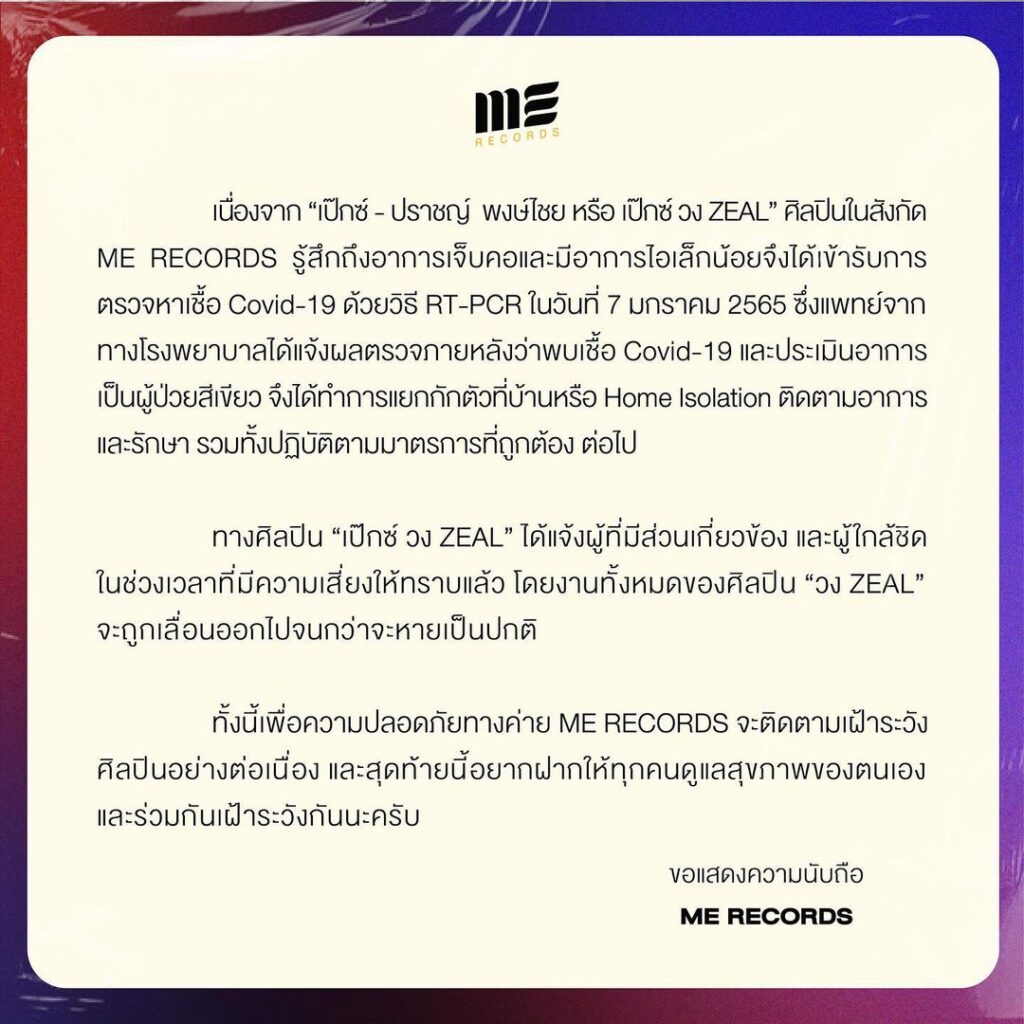 “เนื่องจาก ‘เป๊กซ์ – ปราชญ์ พงษ์ไชย หรือเป๊กซ์ วง ZEAL’ ศิลปินในสังกัด ME RECORDS รู้สึกถึงอาการเจ็บคอและมีอาการไอเล็กน้อยจึงได้เข้ารับการตรวจหาเชื้อ Covid-19 ด้วยวิธี RT-PCR ในวันที่ 7 มกราคม 2565 ซึ่งแพทย์จากทางโรงพยาบาลได้แจ้งผลตรวจภายหลังว่าพบเชื้อ Covid-19 และประเมินอาการเป็นผู้ป่วยสีเขียว จึงได้ทำการแยกกักตัวที่บ้านหรือ Home Isolation ติดตามอาการและรักษา รวมทั้งปฏิบัติตามมาตรการที่ถูกต้องต่อไป