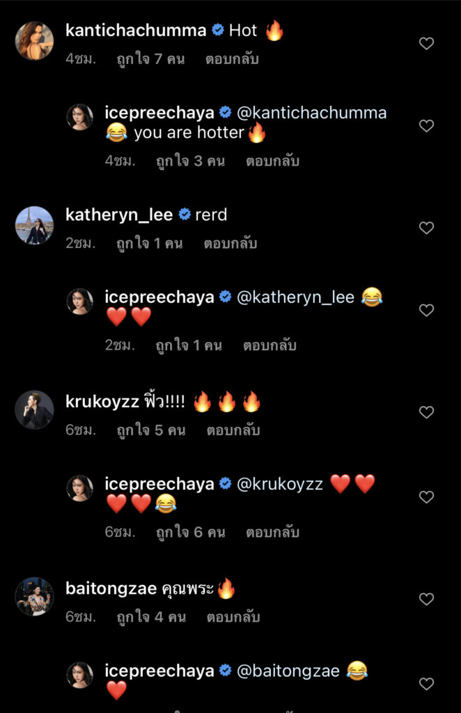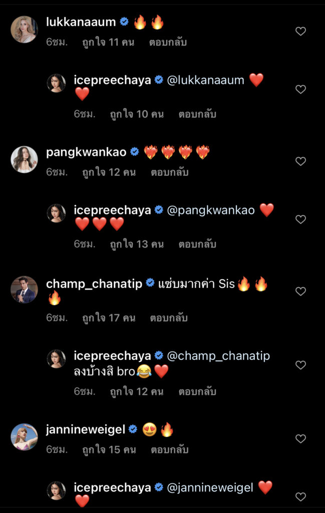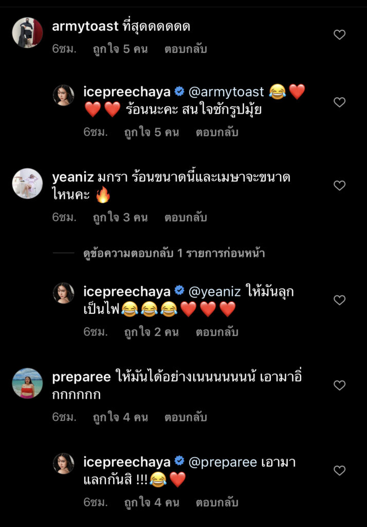 งานนี้ขนาดเหล่าบรรดาตัวแม่ในวงการทั้งหลาย อย่าง อุ้ม ลักขนา , เจนนี่ อัลภาชน์ ณ ป้อมเพชร,ติ๊ช่า ยังแห่กันเข้ามาคอมเมนต์ และเมื่อมีคนถามสาวไอซ์ว่า “มกรายังร้อนขนาดนี้ เมษาจะขนาดไหนคะ” เจ้าตัวก็ตอบได้แซ่บว่า “ให้มันลุกเป็นไฟ”