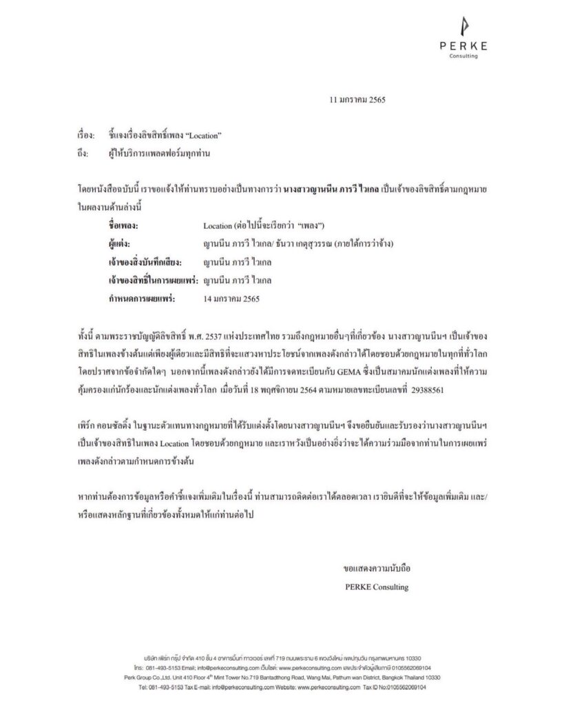 ถ้าเกิดว่าเขาเคลมเพลงขึ้นมา มันก็จะขึ้นว่าบริษัทไหนเคลมคลิปของเรานะคะ ก็จะได้อ่านกันเอาเองแล้วกัน เราจะไม่พูดชื่อบริษัทนะคะ วันนี้ก็เลย อยากจะมาส่งเอกสารทุกอย่างให้ทุกคนดูเพื่อยืนยันว่าเราเป็นเจ้าของจริงๆ ซึ่งเอกสารเหล่านี้เราจะลงใน Social Media ของเราอีกทีหนึ่งหลังจากนี้นะคะ ก็อยากจะขอบคุณ PERKE Consulting ด้วย ที่ช่วยออกหนังสือที่ได้รับการตรวจสอบว่าถูกต้องตามกฏหมายทุกอย่างเพื่อชี้แจงความเป็นเจ้าลิขสิทธิ์ให้ซึ่งเอกสารตัวนี้ก็จะส่งไปตามสถานีวิทยุ แล้วก็รายการต่าง ๆต่อไป