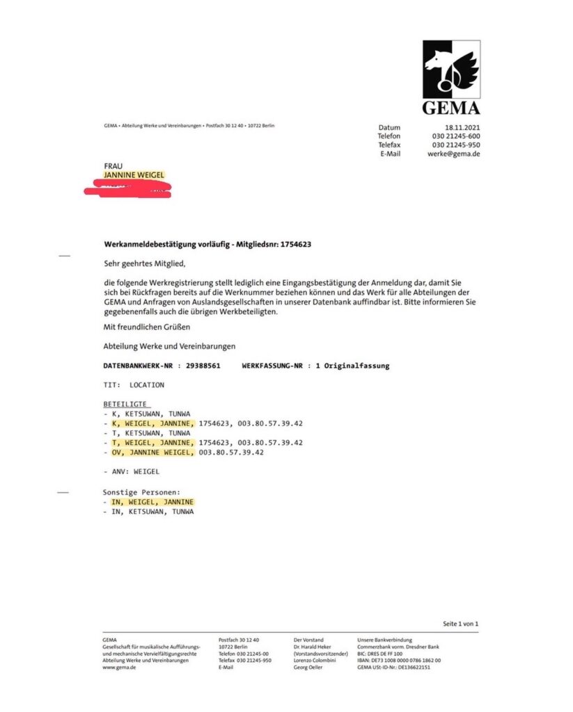 ถ้าเกิดว่าเขาเคลมเพลงขึ้นมา มันก็จะขึ้นว่าบริษัทไหนเคลมคลิปของเรานะคะ ก็จะได้อ่านกันเอาเองแล้วกัน เราจะไม่พูดชื่อบริษัทนะคะ วันนี้ก็เลย อยากจะมาส่งเอกสารทุกอย่างให้ทุกคนดูเพื่อยืนยันว่าเราเป็นเจ้าของจริงๆ ซึ่งเอกสารเหล่านี้เราจะลงใน Social Media ของเราอีกทีหนึ่งหลังจากนี้นะคะ ก็อยากจะขอบคุณ PERKE Consulting ด้วย ที่ช่วยออกหนังสือที่ได้รับการตรวจสอบว่าถูกต้องตามกฏหมายทุกอย่างเพื่อชี้แจงความเป็นเจ้าลิขสิทธิ์ให้ซึ่งเอกสารตัวนี้ก็จะส่งไปตามสถานีวิทยุ แล้วก็รายการต่าง ๆต่อไป