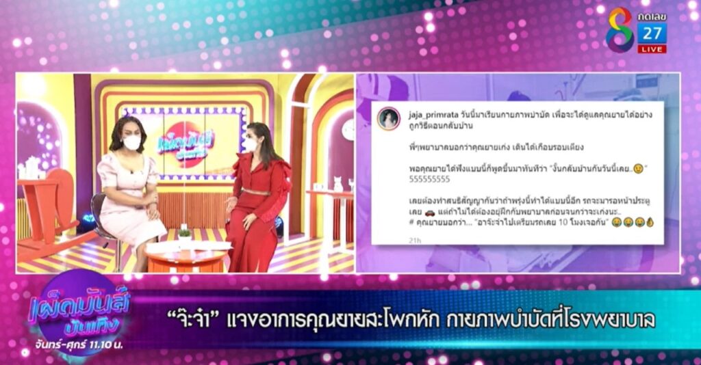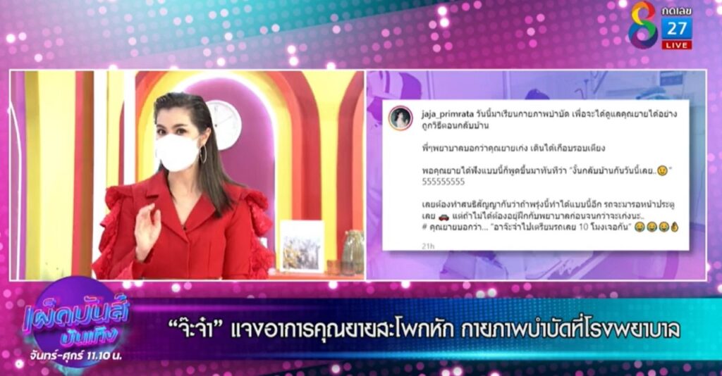 จ๊ะจ๋า เผยว่า “ คือคุณยายจ๋า ตอนช่วงก่อนปีใหม่ค่ะ คุณยายล้มสะโพกแตก กระดูกหัก ทีนี้ต้องผ่าตัด คือคุณยายจ๋า 85 แล้ว ที่เค้าบอกว่าผู้ใหญ่ห้ามล้มเลย คือคุณหมอก็ต้องผ่า แต่ไม่การันตีว่าจะกลับมาเดินได้มั้ย แต่ทีนี้คุณยายจ๋ากำลังใจดีก็อยากจะเดินแต่ต้องทำกายภาพบำบัดค่ะ คือหนึ่งถ้าไม่จ้างพยาบาลก็ต้องทำเอง ทีนี้ช่วงนี้ เค้าก็แนะนำว่าเราควรที่จะต้องเรียนรู้ที่จะต้องทำเอง เพราะมันมีช่วงโควิด ค่าใช้จ่ายเยอะมั้ยคะ ? จริงๆ ก็ต้องเยอะค่ะ แต่คุณยายจ๋ามีบัตรทองใช้สิทธิ์ตัวนี้ได้ ไม่ได้จ่ายตังค์เลย อันนี้ต้องขอบคุณทางโรงพยาบาลจริงๆค่ะ จริงๆ การผ่าตัดสะโพกต้องจ่าย 500,000 นะคะ ถ้าเป็น รพ.เอกชนนะคะ คุณยายก็ขอบคุณมากช่วยประหยัดเงินด้วย คำถามแรกที่คุณยายถามตอนจ๊ะจ๋าไปถึงคือ เอาเงินมามั้ยเค้าคิดเราแพงมั้ย (ยิ้ม) คือที่จ๋าทำงานทุกวันนี้ก็เพื่อจะหาเงินมาไว้ดูแลคุณยายด้วย ได้ข่าวว่าจ๊ะจ๋าไปเรียนทำกายภาพบำบัดให้คุณยายด้วยตัวเอง? ใช่ค่ะ จ๋าไปเรียนทำกายภาพบำบัดมาค่ะ สนุกมากและพวกเราก็ทำได้ง่ายนะคะ คือได้เรียนพลิกตัว เรียนเปลี่ยนผ้าอ้อม แบบเรียนเรื่องการเช็ดตัวเวลาขับถ่าย คุณผู้ชมคะถ้าญาติผู้ใหญ่เรามีการผ่าตัดนะคะ อย่าให้ของเสียในร่างกายโดนตรงแผลเด็ดขาดเลยนะคะ คุณหมอเตือนเลยค่ะ ถ้าติดเชื้อมันคือเรื่องใหญ่จริงๆค่ะ”