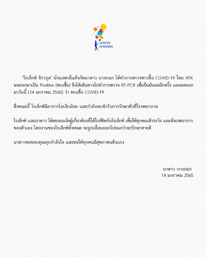 “โรเล็กซ์ จิรายุส” นักแสดงในสังกัดนาดาว บางกอก ได้ทำการตรวจหาเชื้อ COVID-19 โดย ATK ผลออกมาเป็น Positive (พบเชื้อ) จึงได้เดินทางไปทำการตรวจ RT-PCR เพื่อยืนยันผลอีกครั้ง และผลออกมาวันนี้ (14 มกราคม 2565) ว่า พบเชื้อ COVID-19