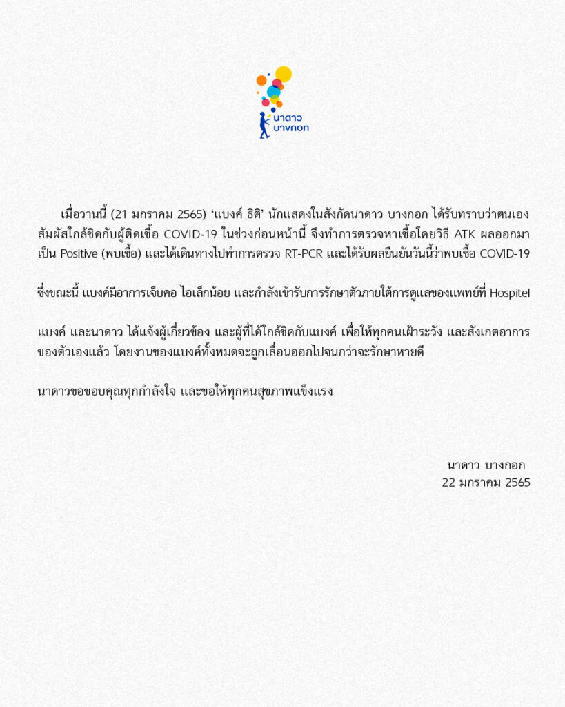 งานนี้ “นาดาว บางกอก” ได้ระบุรายละเอียดว่า… “เมื่อวานนี้ (21 มกราคม 2565) ‘แบงค์ ธิติ’ นักแสดงในสังกัดนาดาว บางกอก ได้รับทราบว่าตนเองสัมผัสใกล้ชิดกับผู้ติดเชื้อ COVID-19 ในช่วงก่อนหน้านี้ จึงทำการตรวจหาเชื้อโดยวิธี ATK ผลออกมาเป็น Positive (พบเชื้อ) และได้เดินทางไปทำการตรวจ RT-PCR และได้รับผลยืนยันวันนี้ว่าพบเชื้อ COVID-19
