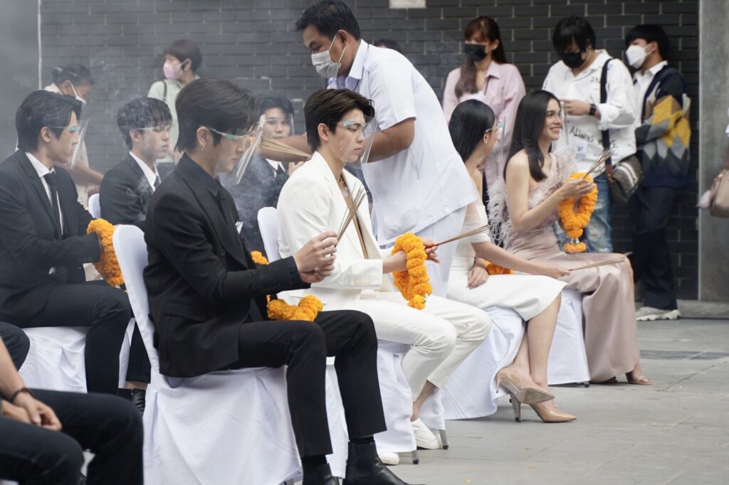 โดยบรรยากาศในงานพิธีบวงสรวงคึกคักตั้งแต่เช้าตรู่กับกองทัพสื่อมวลชน รวมถึงเหล่าบรรดาแฟนคลับที่หอบช่อดอกไม้มาร่วมแสดงความยินดีกับนักแสดงอย่างอบอุ่น โดยทุกคนที่เข้ามาร่วมงานได้ผ่านการตรวจคัดกรองโควิด-19 อย่างเคร่งครัดตามมาตรการ