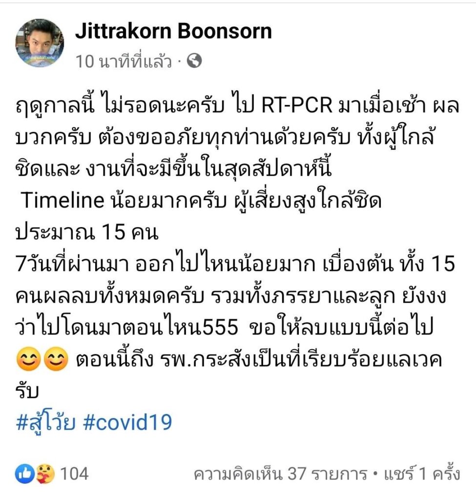ขณะเดียวกันฟลุ๊ค ไอน้ำ ได้โพสต์ในเฟสบุ๊ก Jittrakorn Boonsorn ว่า..“ฤดูกาลนี้ ไม่รอดนะครับ ไป RT-PCR มาเมื่อเช้า ผลบวกครับ ต้องขออภัยทุกท่านด้วยครับ ทั้งผู้ใกล้ชิดและ งานที่จะมีขึ้นในสุดสัปดาห์นี้ Timeline น้อยมากครับ ผู้เสี่ยงสูงใกล้ชิดประมาณ 15 คน 7วันที่ผ่านมา ออกไปไหนน้อยมาก เบื่องต้น ทั้ง 15 คนผลลบทั้งหมดครับ รวมทั้งภรรยาและลูก ยังงงว่าไปโดนมาตอนไหน555 ขอให้ลบแบบนี้ต่อไปตอนนี้ถึง รพ.กระสังเป็นที่เรียบร้อยแลเวครับ#สู้โว้ย #covid19”