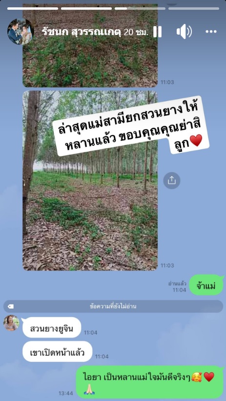 นอกจากนี้เจ้าตัวยังแคปชั่นภาพนี้ว่า “ล่าสุดแม่สามียกสวนยางให้หลานแล้ว ขอบคุณคุณย่าสิลูก”