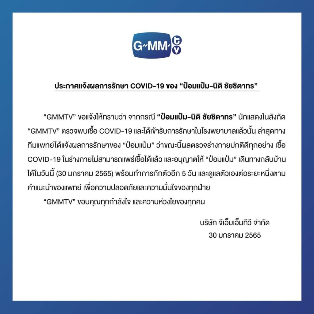 หลังจากที่ก่อนหน้านี้ออกมาประกาศติดเชื้อโควิด-19 และเข้ารับการรักษาตัวตามขั้นตอนตั้งแต่วันที่ 26 มกราคม 2565 สำหรับพิธิกร นักแสดง “ป๋อมแป๋ม นิติ” หลังจากนั้นทางต้นสังกัดได้แจ้งผลการรักษาตัวเป็นปกติ ไม่สารถแพร่เชื้อได้แล้ว แพทย์จึงอนุญาตให้กลับบ้านได้ในวันที่ 30 มกราคมที่ผ่านมา และต้องกักตัวต่ออีก 5 วันเพื่อดูแลตัวเองตามคำแนะนำของแพทย์