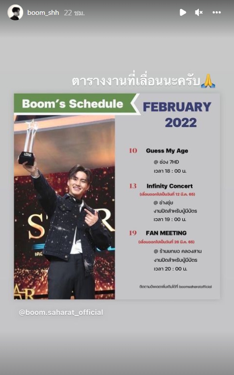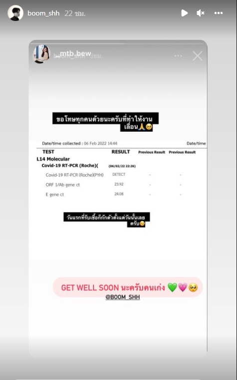 ที่ล่าสุดเจ้าตัวได้โพสต์ภาพแจ้งผลการตรวจหาเชื้อโควิด19 ผ่านไอจีสตอรี่ พร้อมเขียนข้อความแจ้งว่า “ขอโทษทุกคนด้วยนะครับที่ทำให้เลื่อนงาน วันแรกที่รับเชื้อก็กักตัวตั้งแต่วันนั้นเลยครับ”