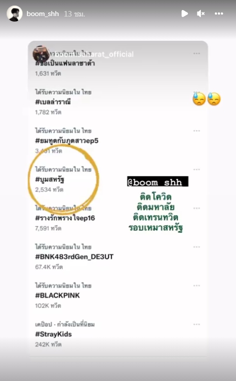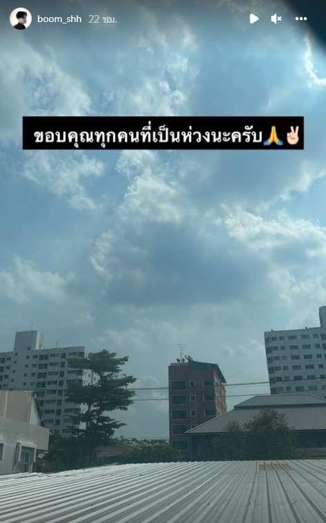 ต่อมาหนุ่มบูมยังได้โพสต์ภาพวิวนอกห้องและเขียนข้อความขอบคุณแฟนๆว่า “ขอบคุณทุกคนที่เป็นห่วงนะครับ” พร้อมติดอีโมจิยกมือไหว้และชูสองนิ้ว เพื่อบอกว่าตนเองสู้ ๆ ท่ามกลางแฟนคลับเข้ามาให้กำลังใจและอวยพรให้หายป่วยเร็วๆเป็นจำนวนมาก